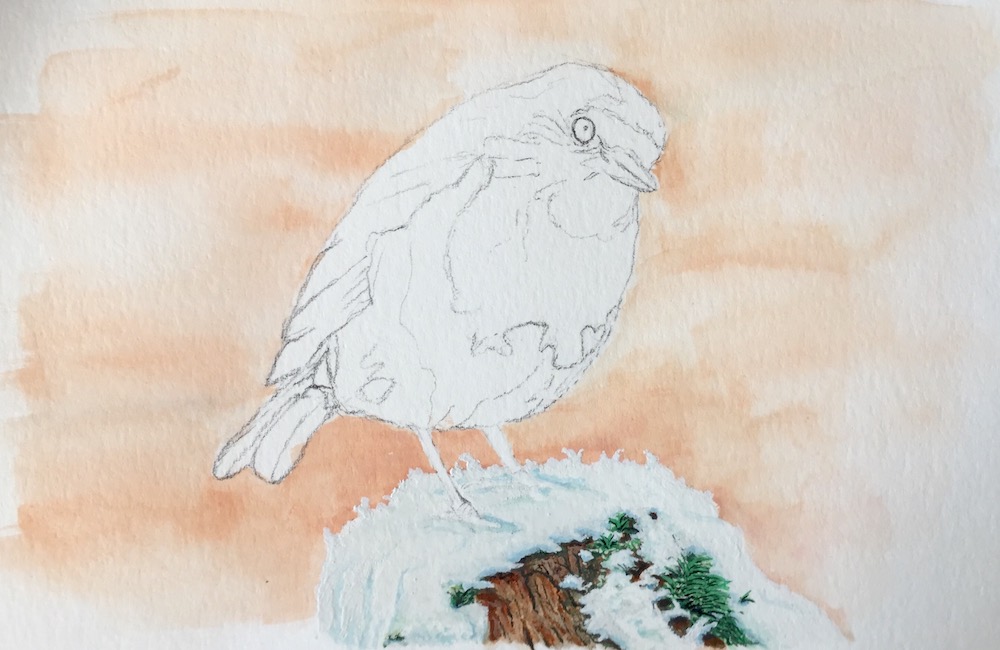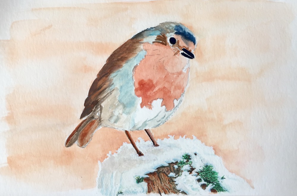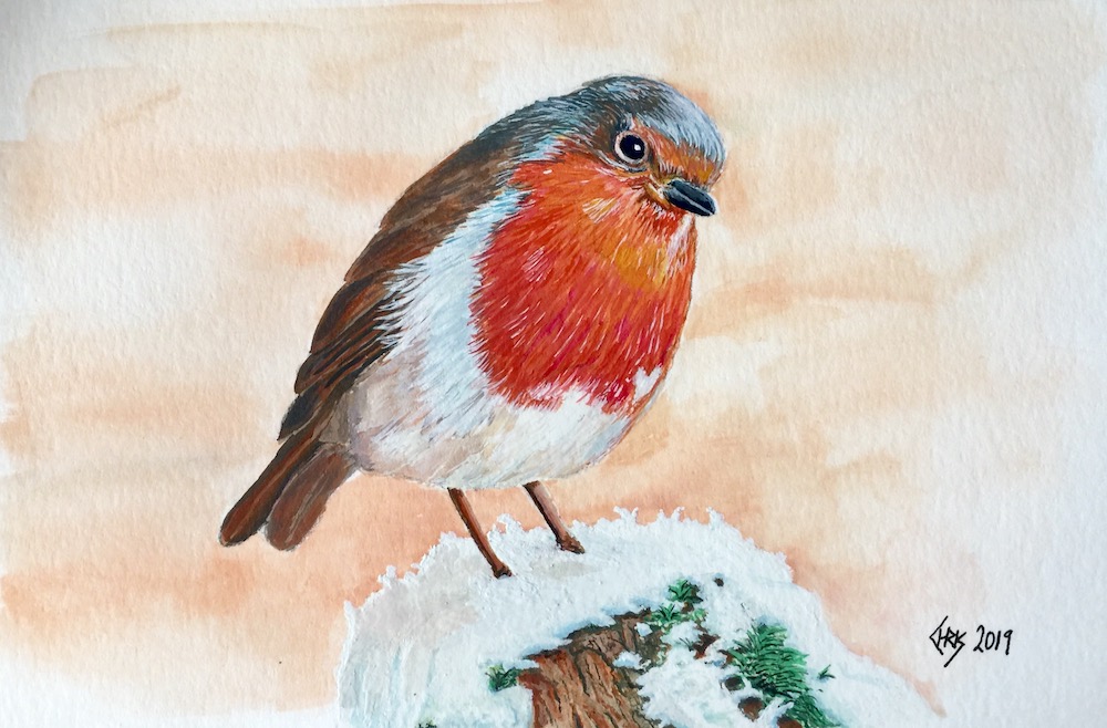 Well the fence post that this little robin was sat on didn’t have and snow to paint since it was summer in England. I had to use someone else photo of snow as a guide.
