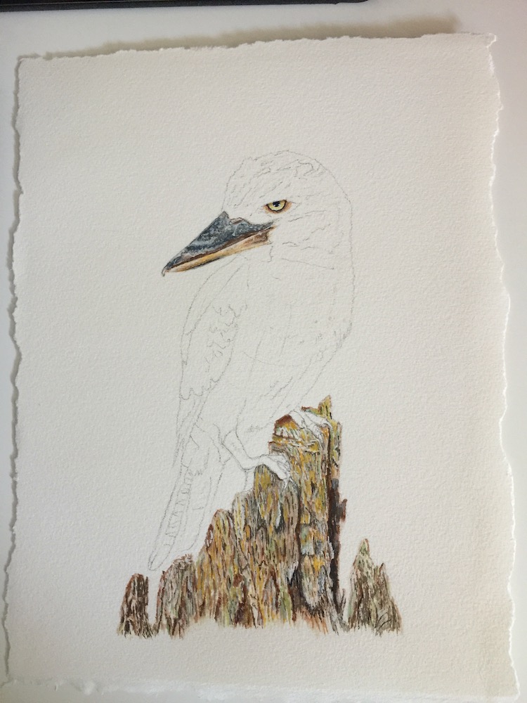I think this was a favourite tree of the kookaburra as it was covered in poop, which I decided to only paint a fraction of it.