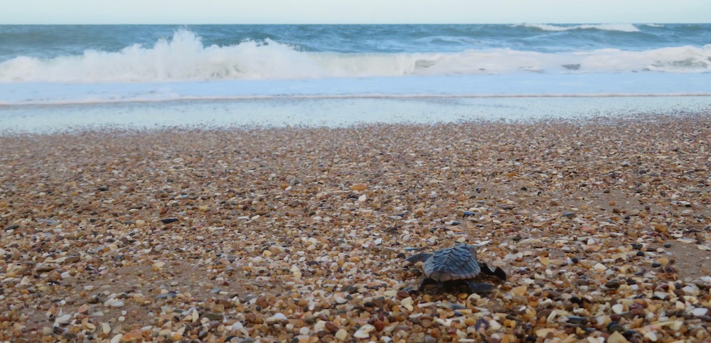 Now when the turtle exits the nest it’s covered in sand and has a rather dull looking grey head and shell. Once the first wave crashes over the turtle and sends it into a tumbling nightmare up the beach.