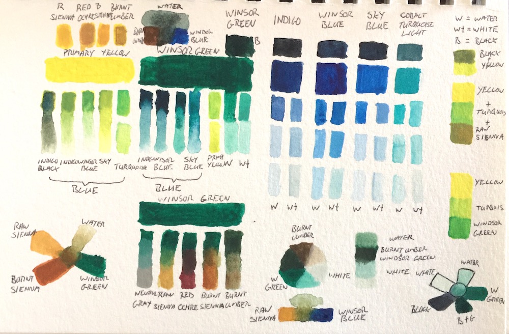 I spent the next 1hr or so playing around with all the blues I had mixed with yellow and all the greens mixed with yellows and reds.