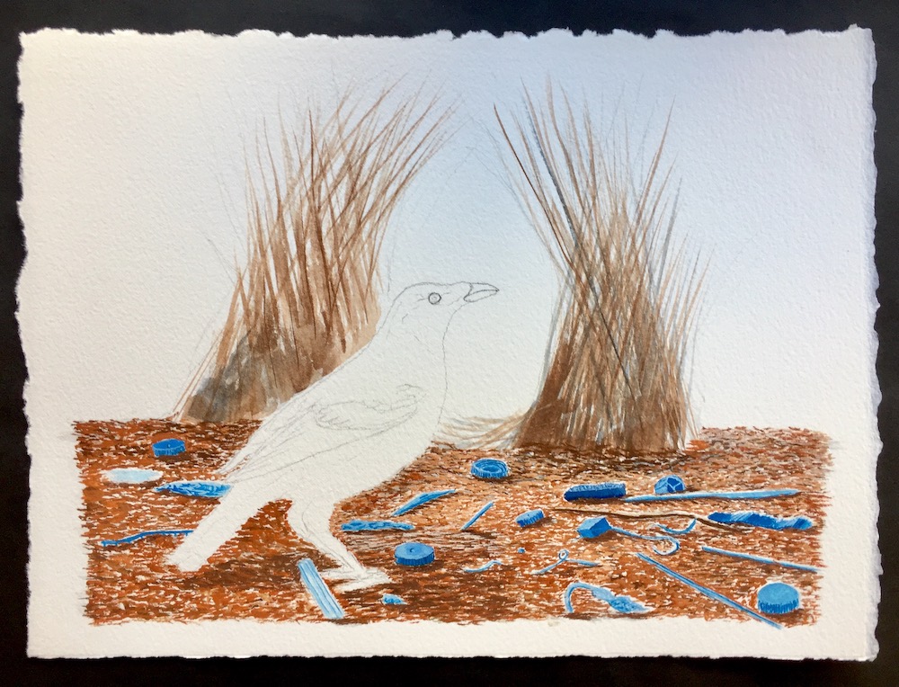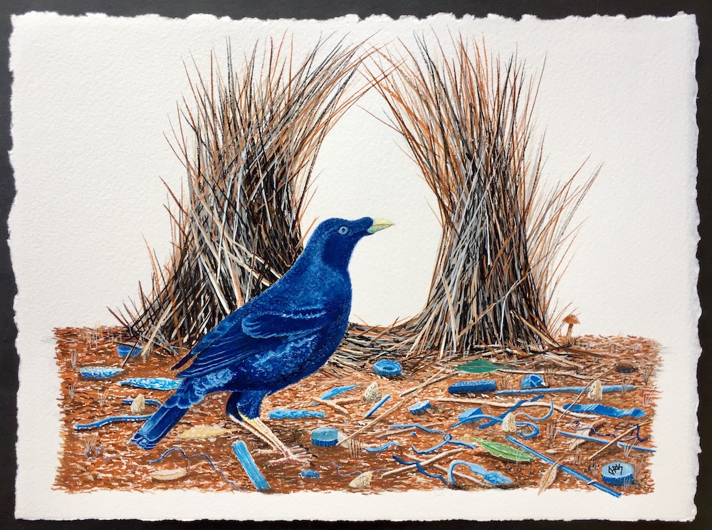 I like this painting as its more of a scene than just an illustration of a bird. It was also fun compositing two photos together to make the final image and place the bower birds head in a frame of twigs.
