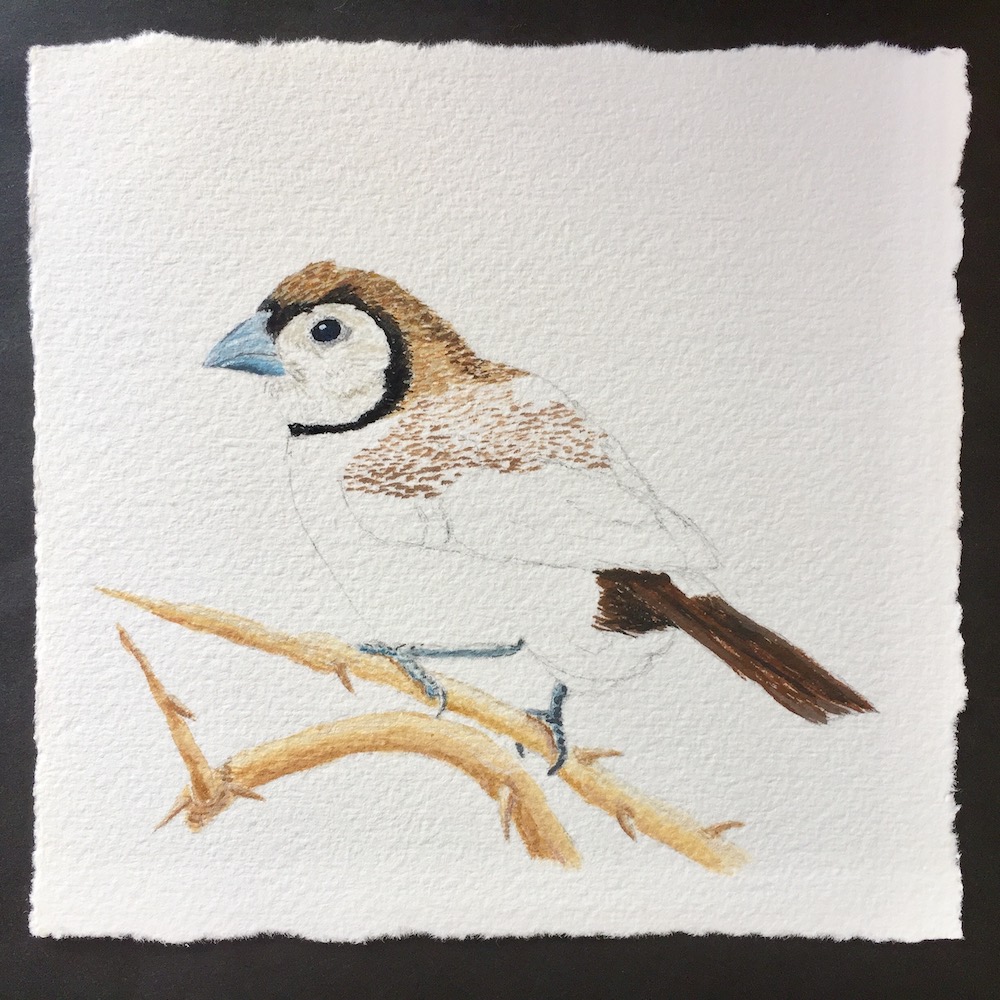 I started painting the twig, then moved onto the eye, beak, tail and then the rest of the body.