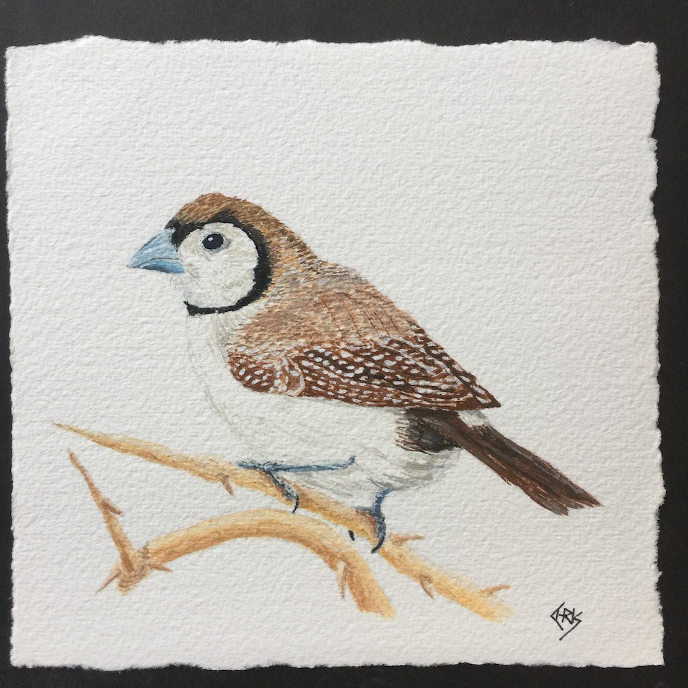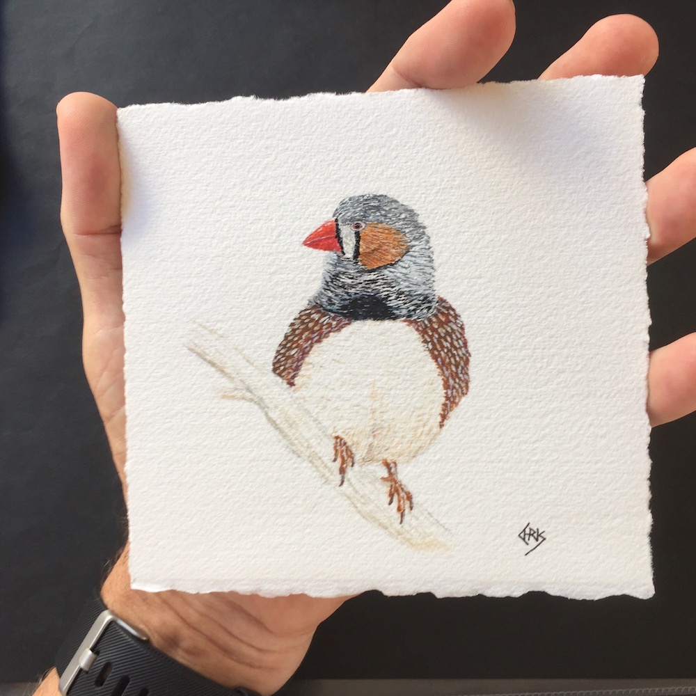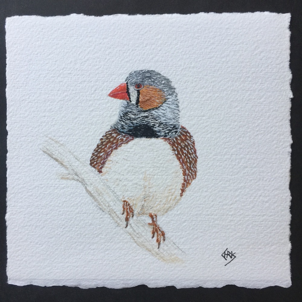 A close up of my zebra finch painting to show you the small scale. Note my other bird and animal paintings are a little larger than the triptych.