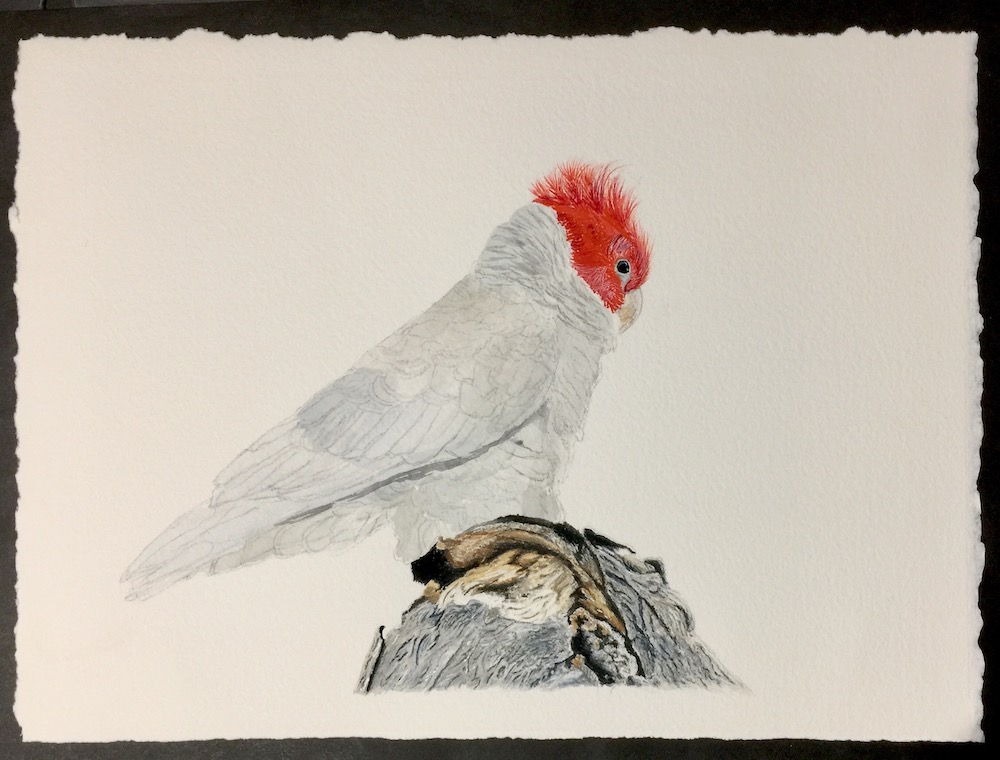 Gang Gags are my obscession at the moment and I have only just come across your page. Thank you, I find it quite helpful. I have painted them in watercolour, using gouache to paint in the white tips of the feathers in last. Also used a red pastel to highlight the red feathers above his beak to make them pop. I am now giving them a try in acrylic paint. I have seen them bred in captivity only and can tell you the male is very agressive during mating season and the owner had to make an armour made of wire netting just to get into the aviary and feed them etc. I was surprised as their facial expression is one of a friendly, totally relaxed bird. (It is a very large aviary with an iron bark tree growing inside it and the nest was a hole in the trunk of the tree.) Thanks again for your assistance.