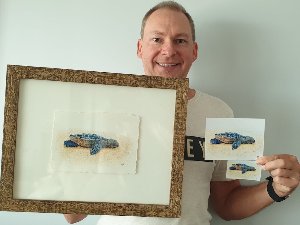 In my hand I’m holding some postcards and a fridge magnet that mum agreed to try and sell to guests after they go on turtle tours along with other postcards I have created.
