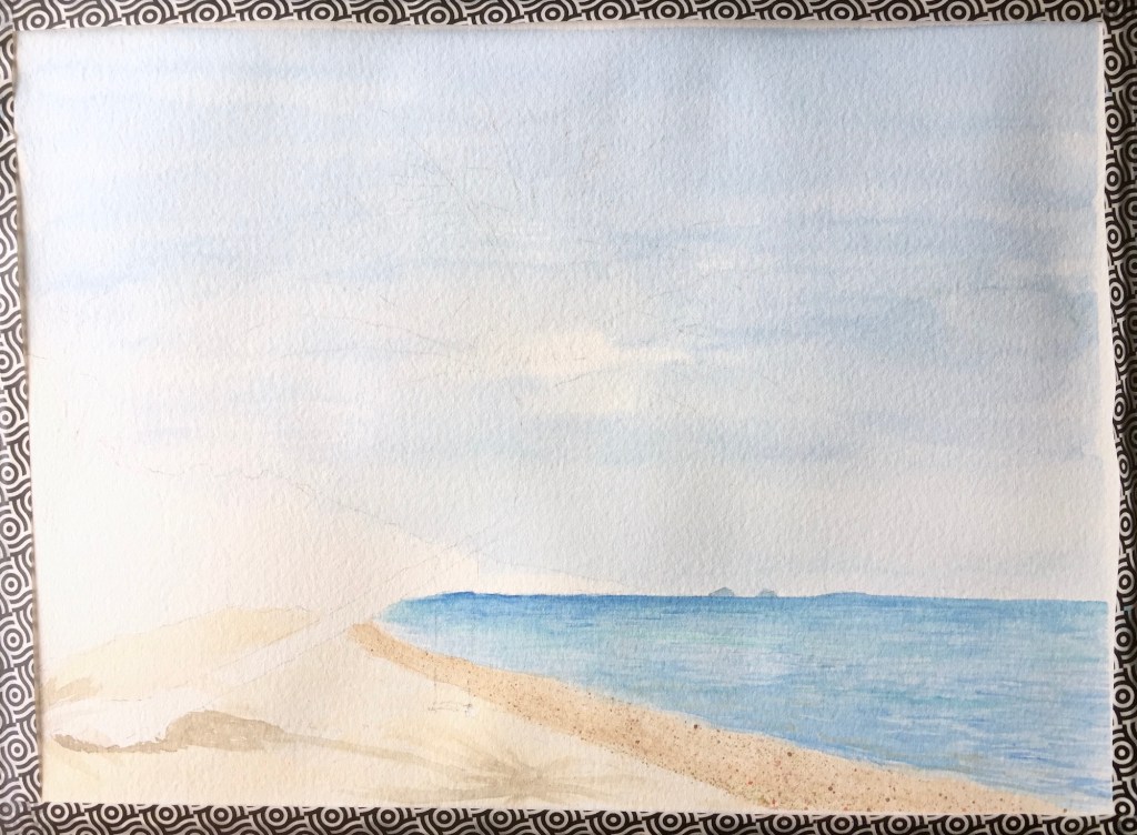 Starting with a light wash for the sky, I then moved on to painting the water and hopefully giving it a nice warm feel, something that you would love to swim in.