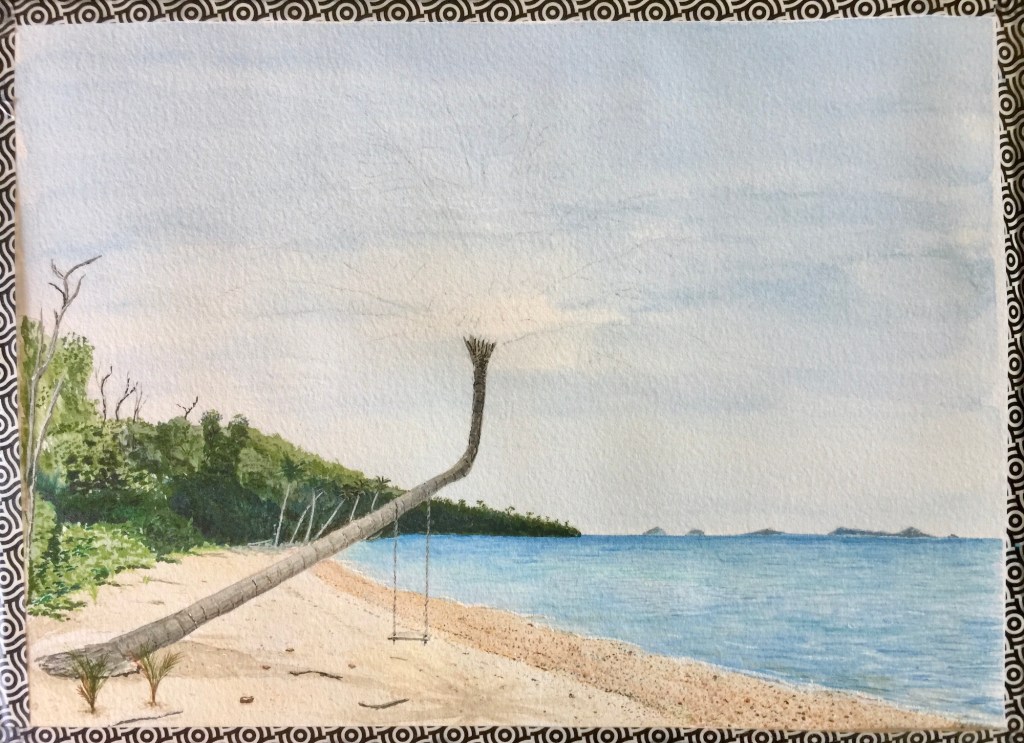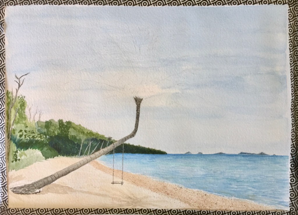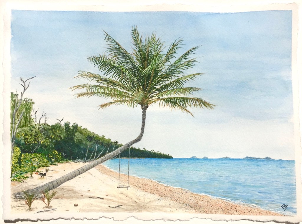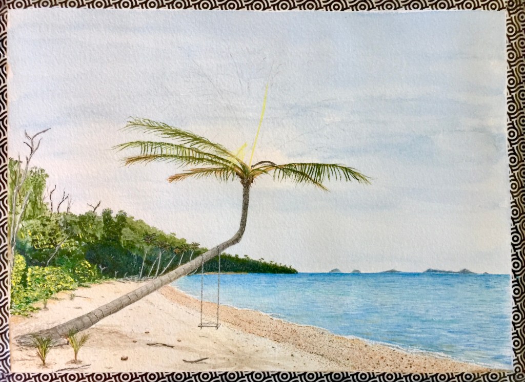 I liked the look of the palm tree leaning out towards the sea and imagined a swing hanging from it, so being an artist thats what I added. Unfortunately I added the swing then painted the palm tree shadow so you would have to be well over 6ft to get on it. Always pay attention to what your painting.