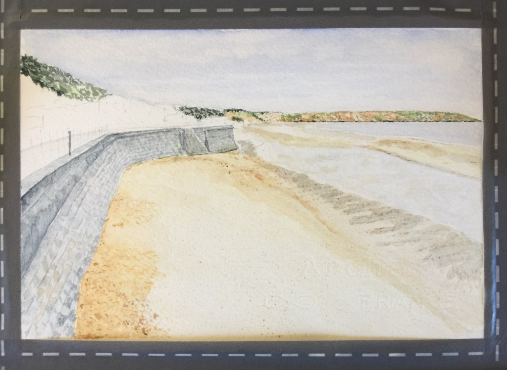 If you look closely from this angle you can see the multi coloured beach huts on the top of the sea wall. This is a reference point, looking back to where I’m standing and from where I photographed the scene to paint my watercolour.