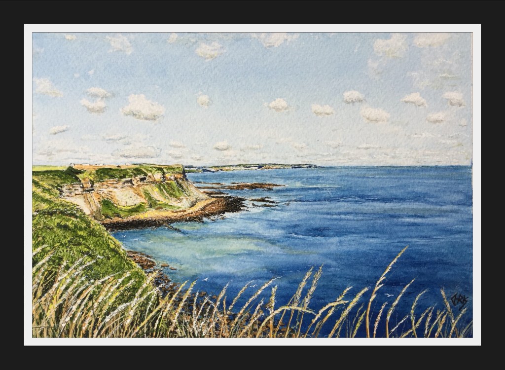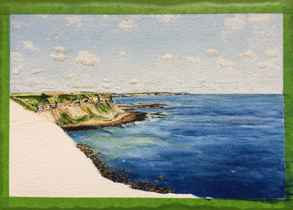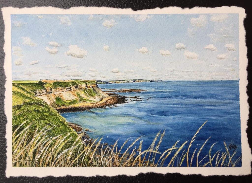 This was fun to paint all the different layers of rock and grasses and its not a seascape without a few seagulls.