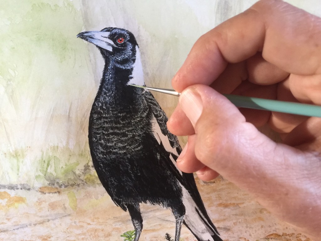 Adding the fine details and shine to the magpies feathers, I use a little blue mixed in with the white.