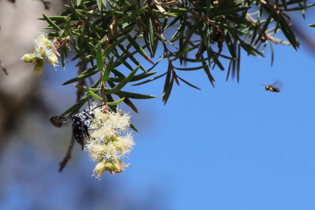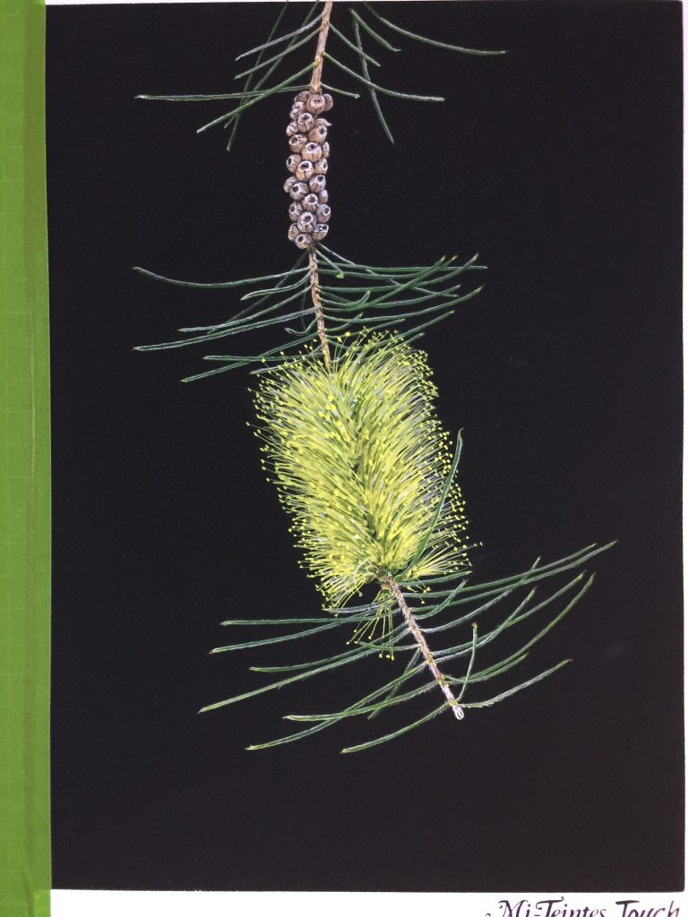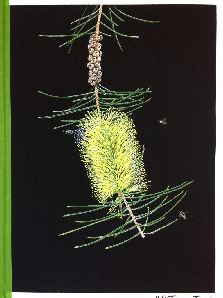 Just behind my cottage at Possum Park there is some beautiful plants and trees that attract all sorts of insects. Since the bottle brush had almost stopped flowering it didn’t have many insects on it. The other tree was in full flower and had 5 types of bees and a few wasps, so I combined the two photos to create this painting.