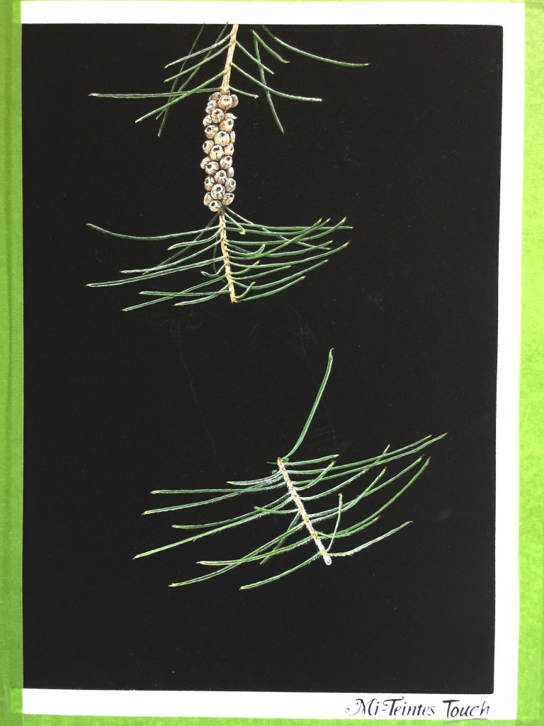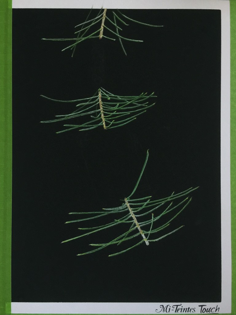 I wanted to paint all the needles in one go so I could match the colours. Because my paintings are very detailed and take a rather long time, I wanted to make sure I used the same order of colours.