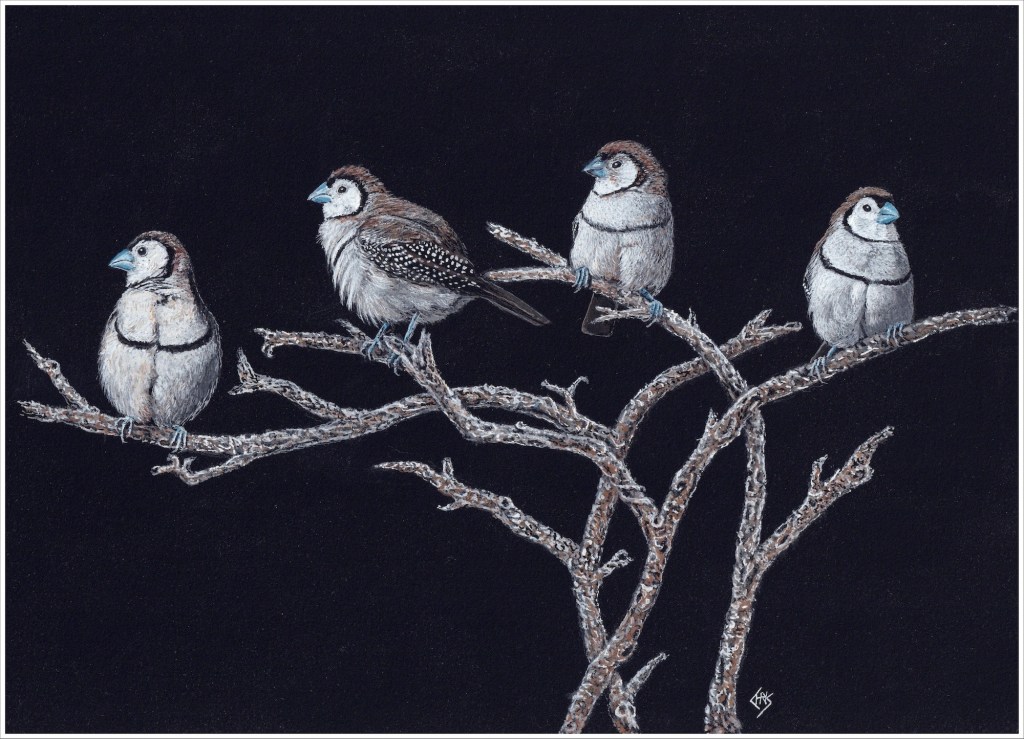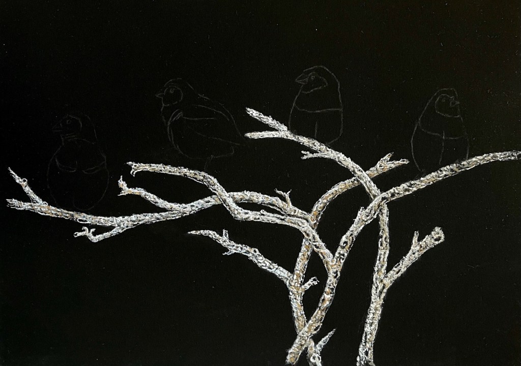 I decided to make this painting very monochrome with just a hint of colour on the birds beaks and feet and totally disregard the green foliage on the tree.
