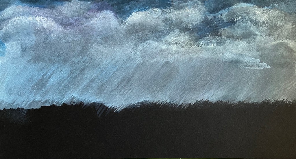 This was my first attempt at painting a landscape on black paper and I was trying another brand, Stonehenge Aqua Black Watercolour paper. The water seemed to soak in very quickly and I didn’t have much chance to blend my colours.