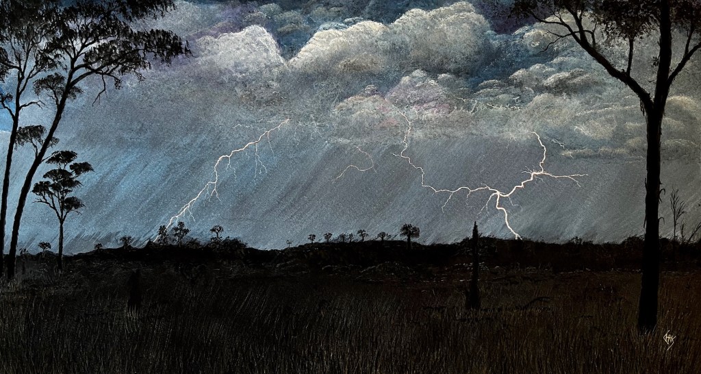The next flash of light I realise I’m talking to a bush, feeling stupid I move on as I see john further down the paddock. “So hows the photograph John”, still no answer. Then a thump thump thump, another flash of lightning still doesn’t light up John.
