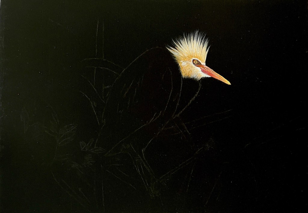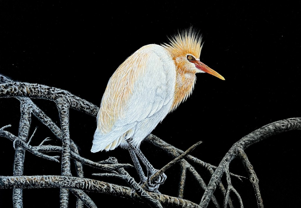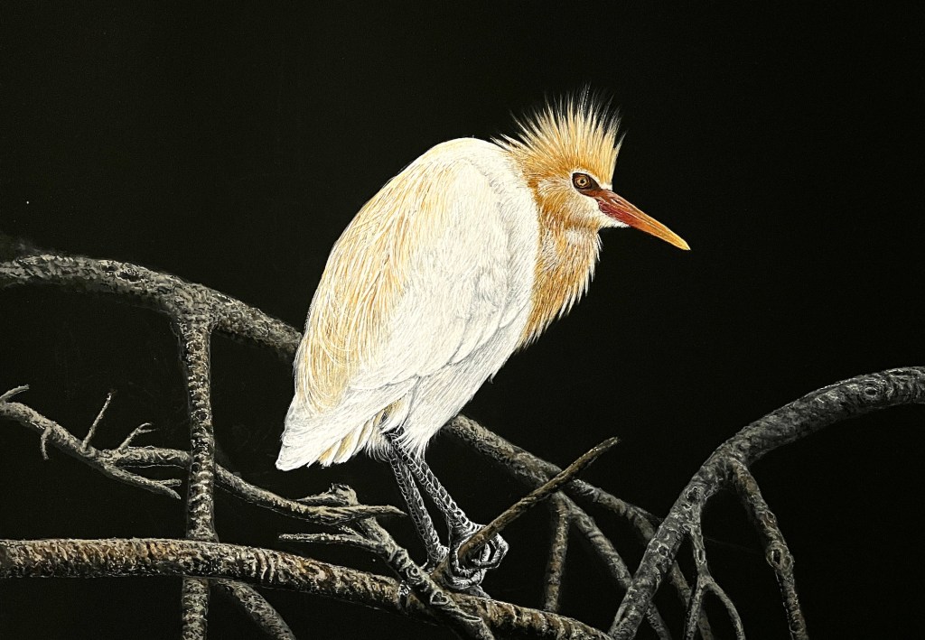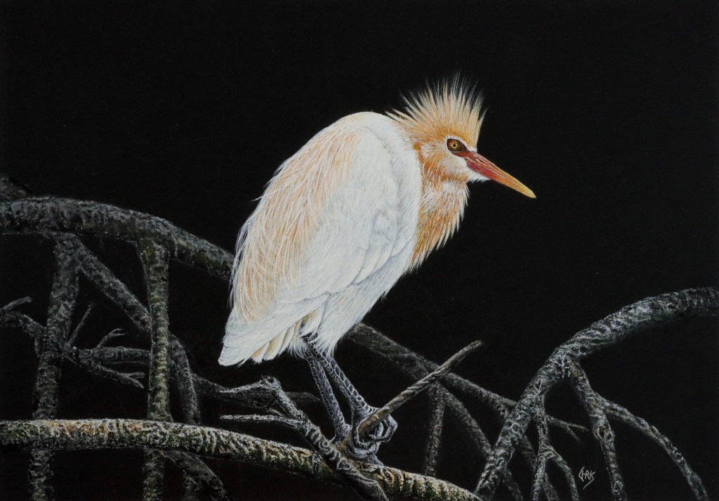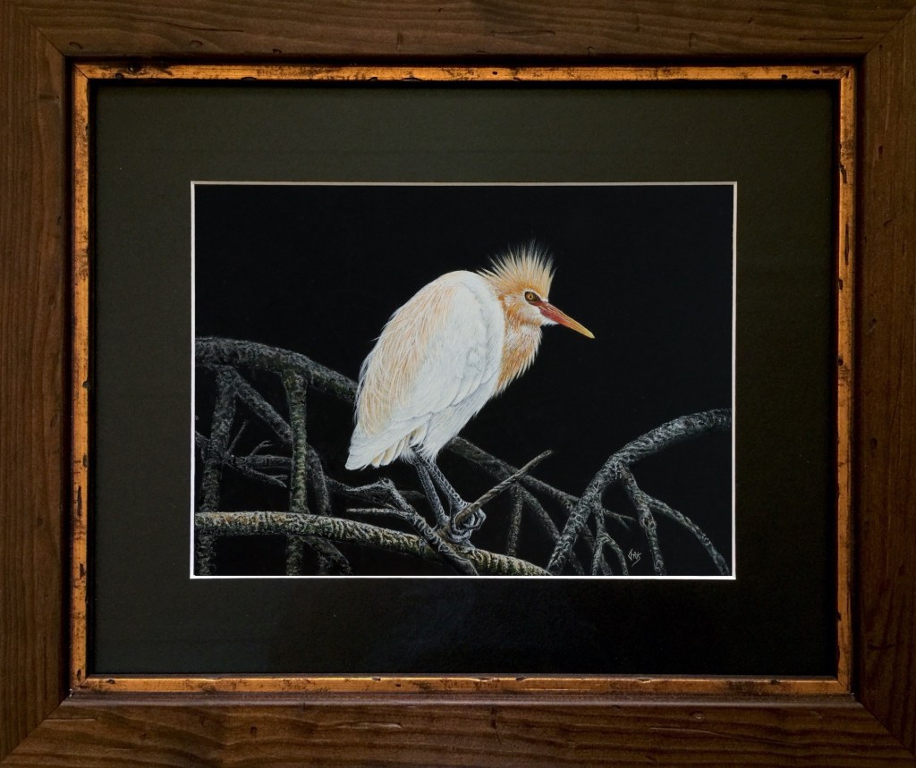 Finished painting of the cattle egret catching a bit of afternoon sun.
