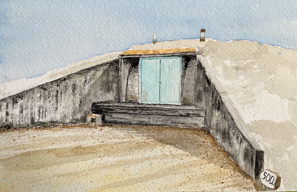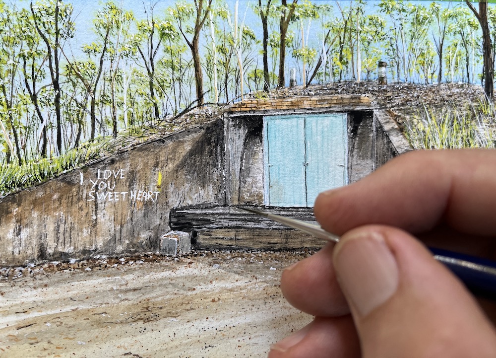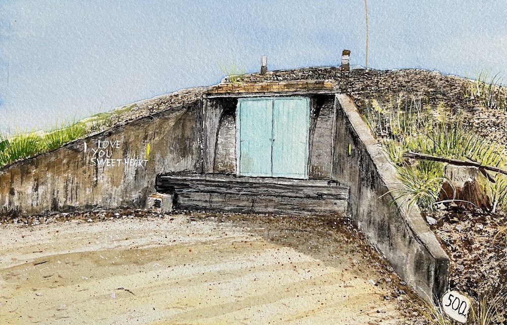 I have already painted bunker 19, which has been turned into accommodation, so I thought I would paint one of the storage bunkers. After I saw the sign “I love you sweetheart” I knew this was the one to paint.