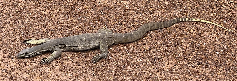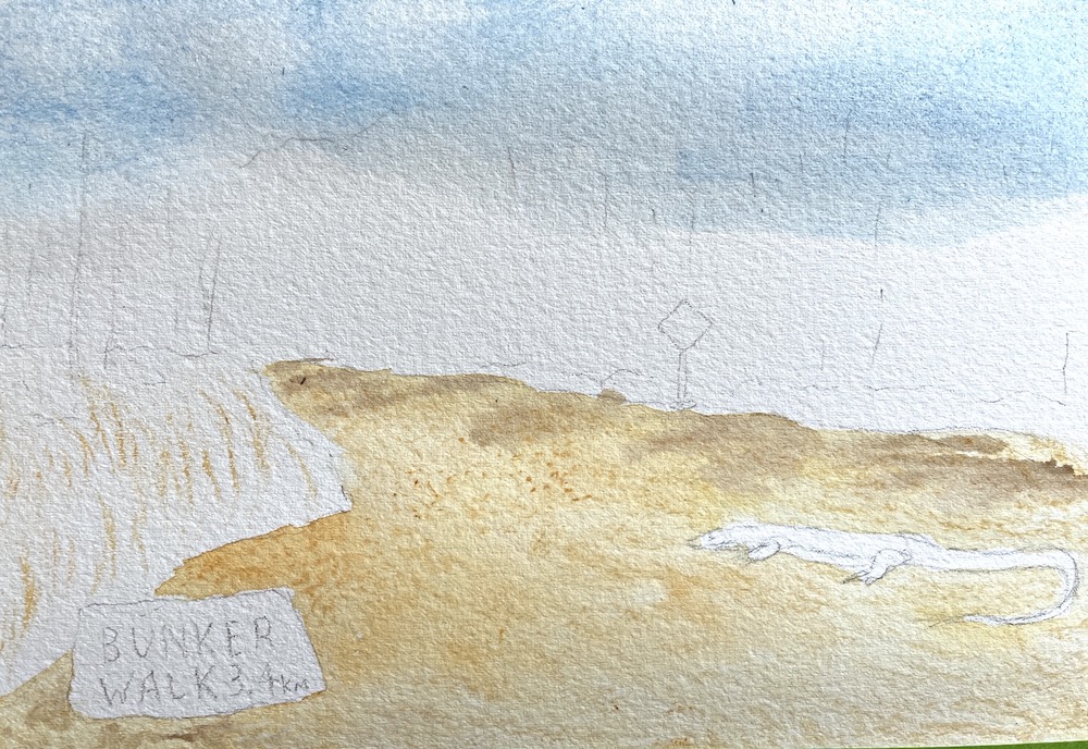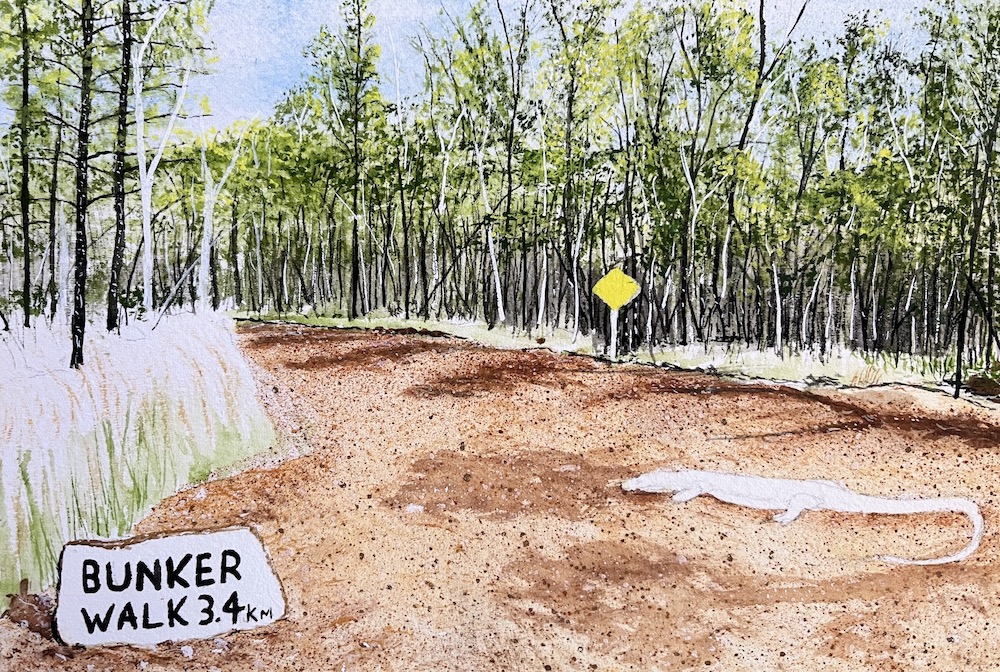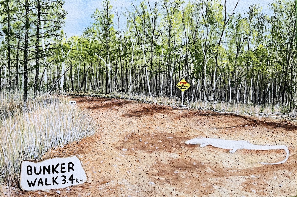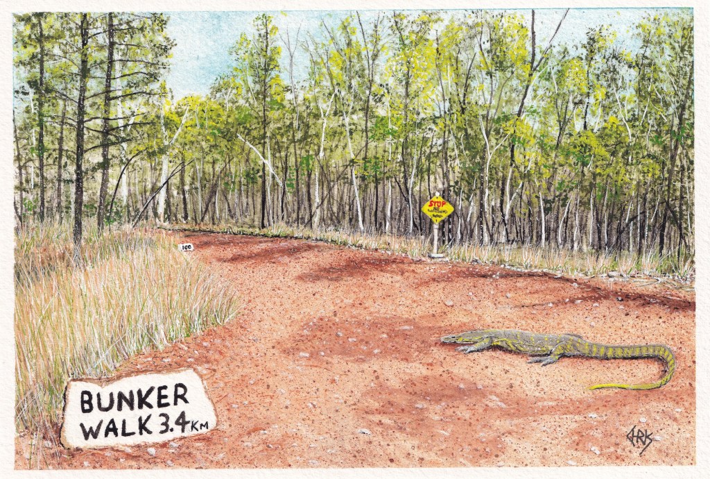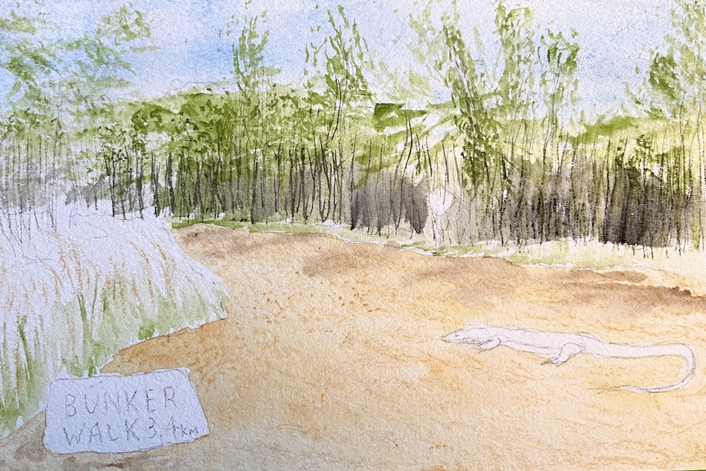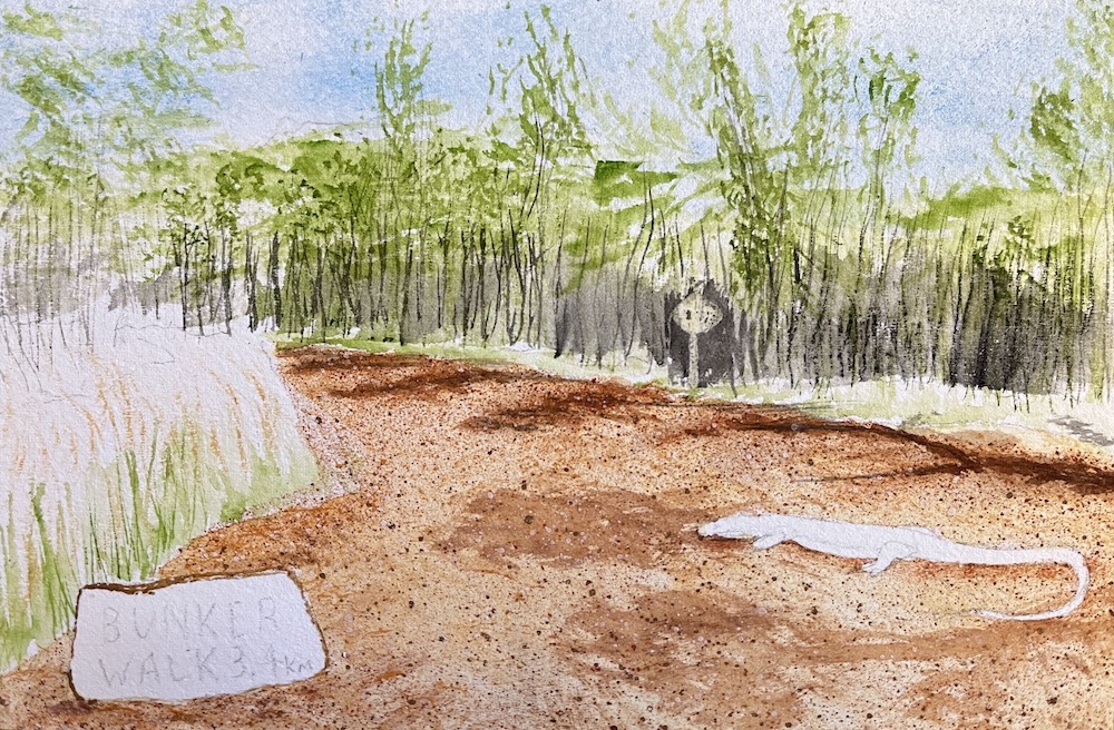 A few months ago I was walking just past the 2.5km sign and came across a lace monitor sunning itself on the road. I walked up to it slowly and was able to get a few photos before it run off. So I combined the start of the bunker walk and the lizard to make the bunker walk 3.4km painting.