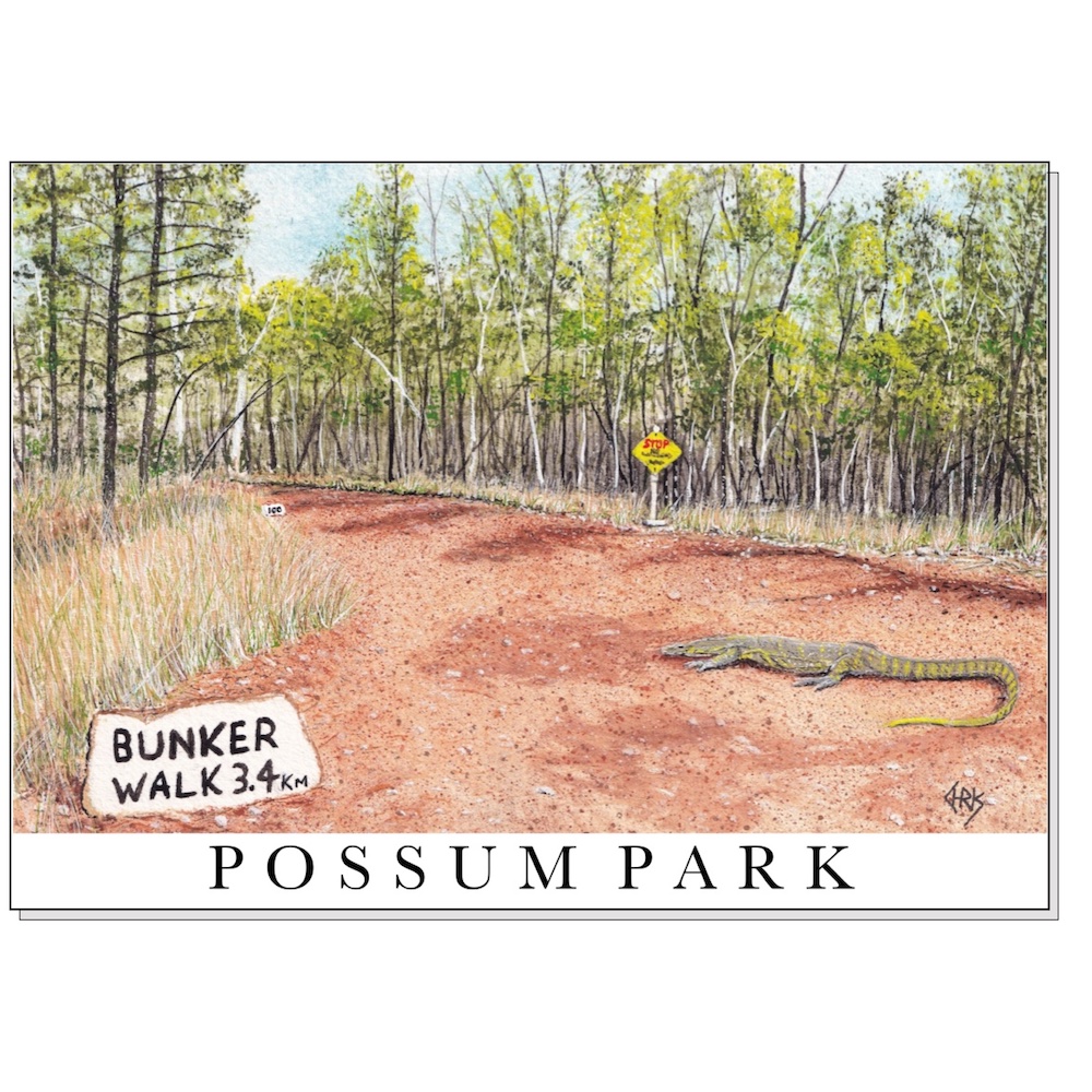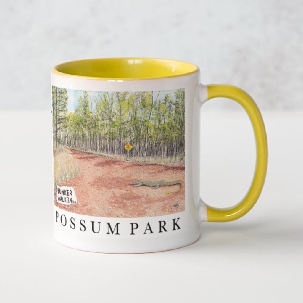 As you can see below my Bunker Walk 3.4km artwork has been turned into a postcard and coffee mug for Possum Park, and possibly greeting cards later in the year. Yellow Handle to match the sign, lizards tail and tree highlights.