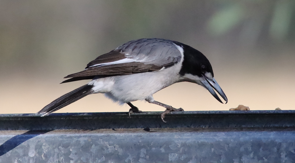 About a month ago I was photographing birds in the backyard with my 600mm lens and I spotted a grey butcherbird, which seemed to find a bit of peanut butter that I wiped off my fingers while emptying the mouse traps.