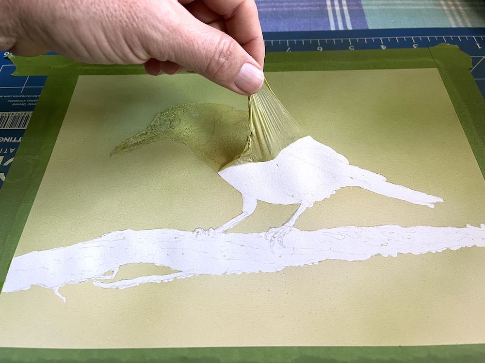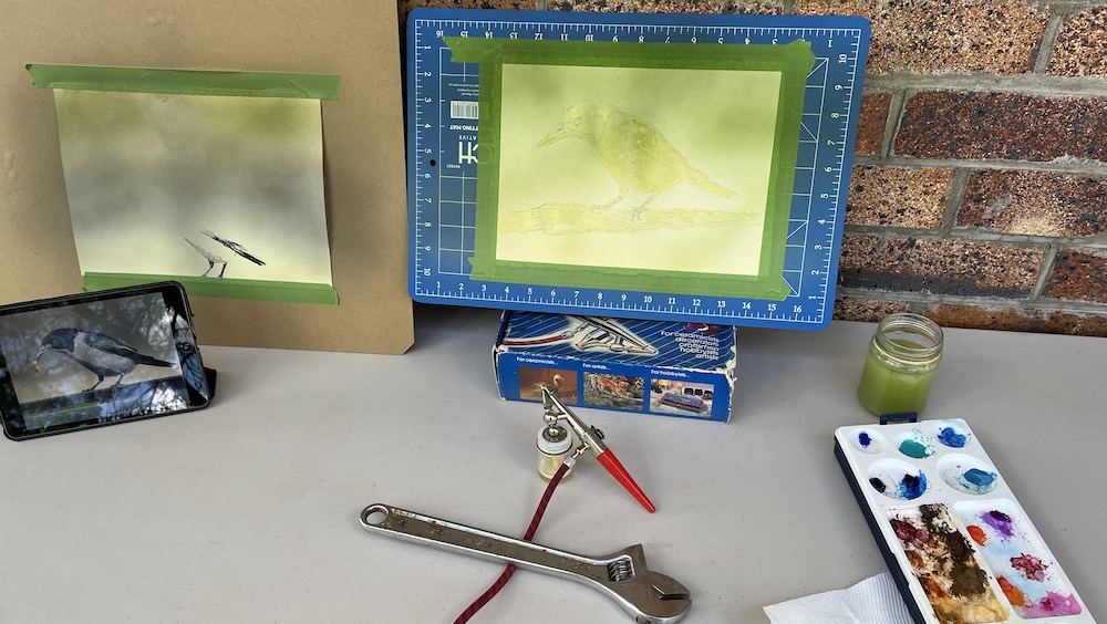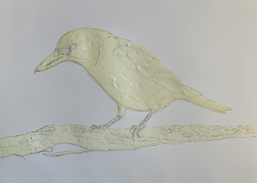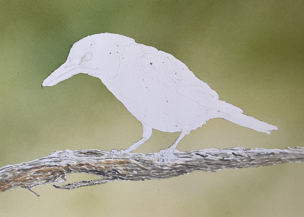 After the bird outline is on the paper I covered it with masking fluid. I used hot pressed paper because it was nice and smooth and probably better for airbrushing.