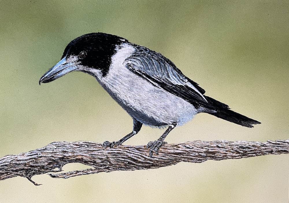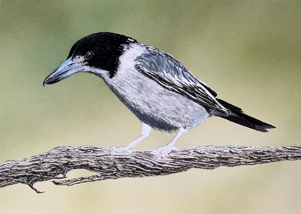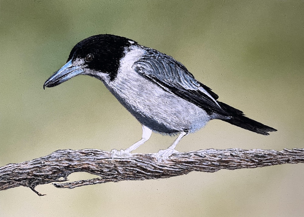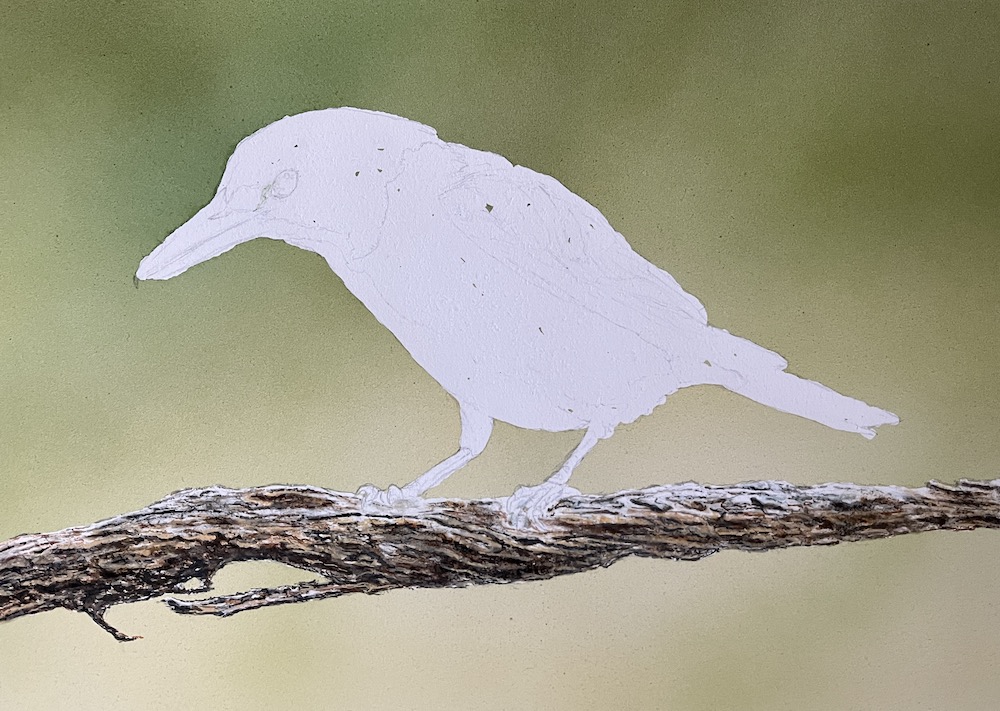 I was using another one of my photos as a reference of a branch as I didn’t want to paint the steel fence that the bird was standing on. I was after a more natural looking painting with some better shapes than the fence could provide.