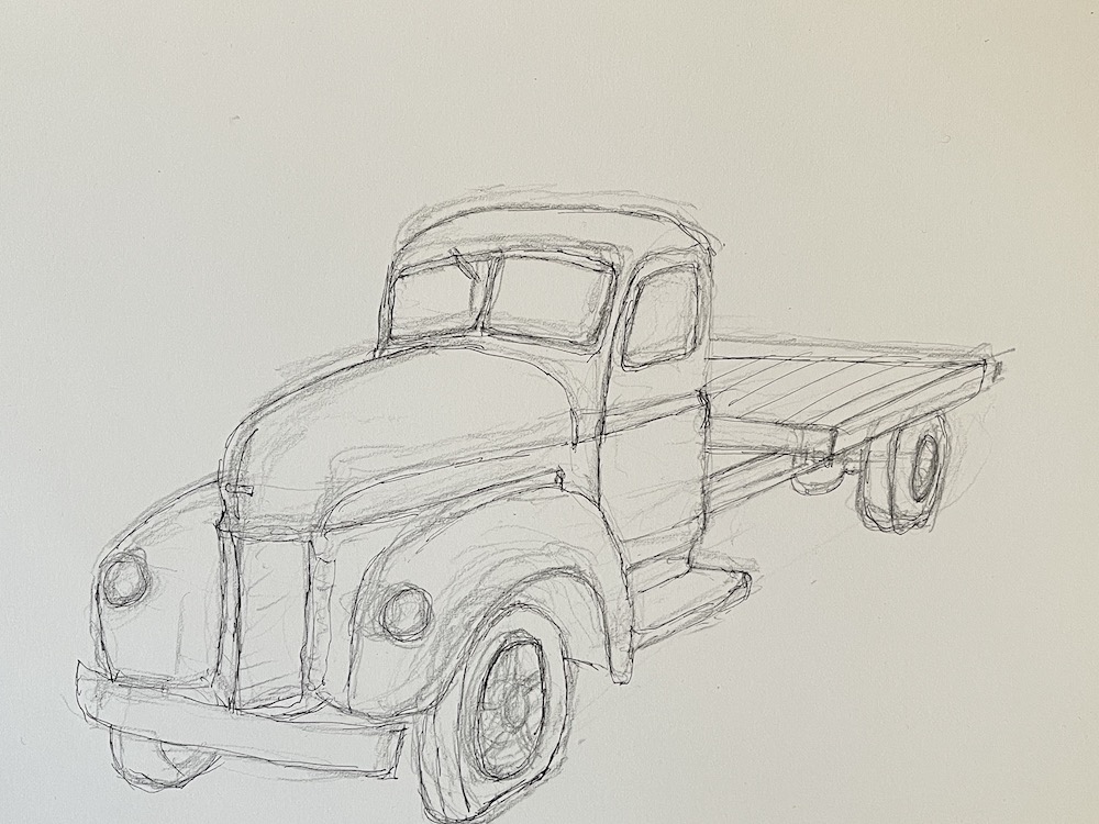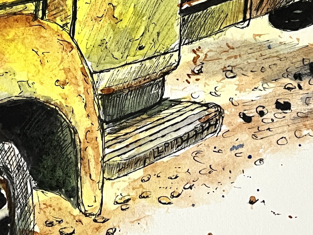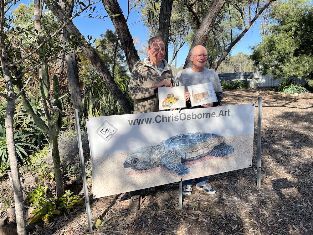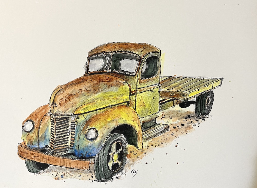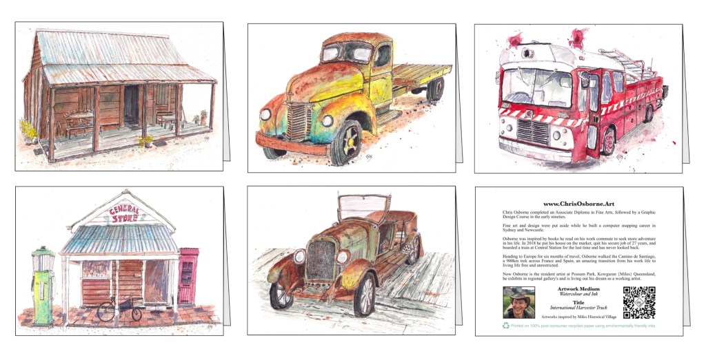 The proud owner of two original artworks in my new style of urban sketching, Hippong homestead and the International harvester truck. The truck was the first sketch form my Miles historical Village collection.