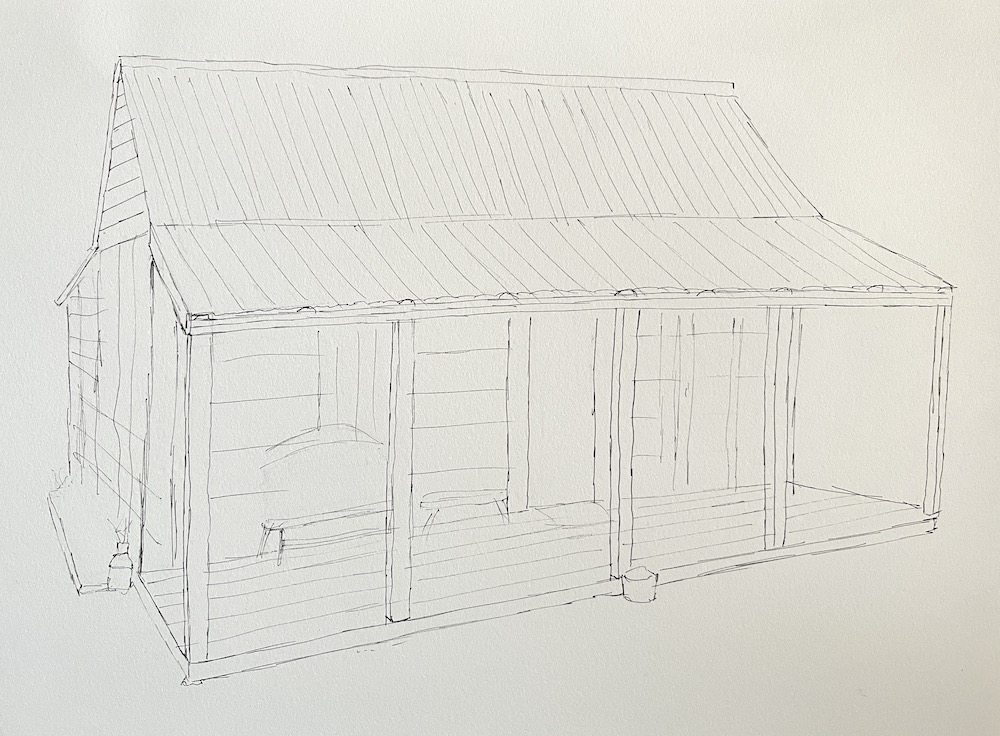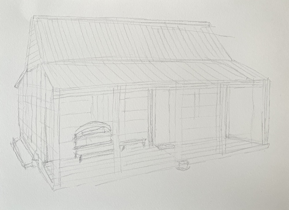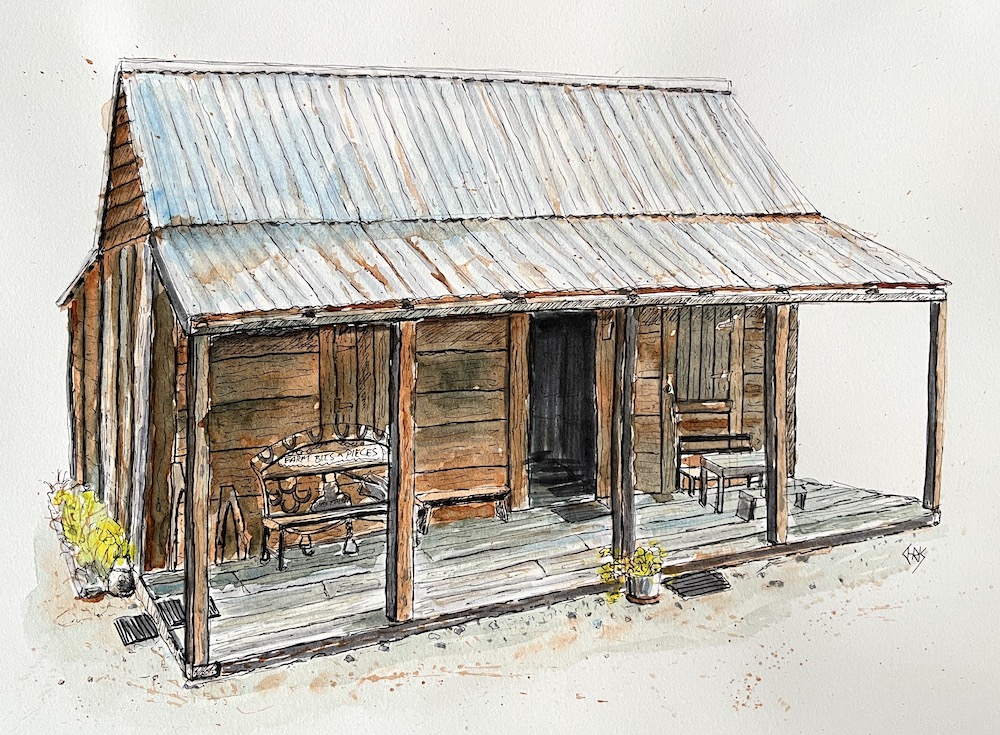 Adding the watercolour to create a nice tin roof and a representation of all the timber planks.