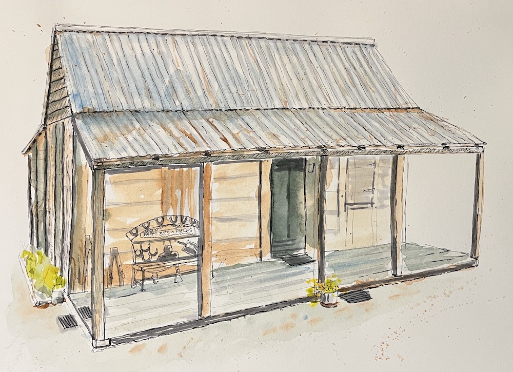 Sketch 5 from the Miles Historical Village and Museum, the Hippong Homestead. This was a wonderful building to sketch but I was a little worried because of its bland colours. I absolutely love the hand made seat, with all the horse shoes and shovels welded into the backrest. I thought I had some more photos of it as well as inside the building but obviously not.