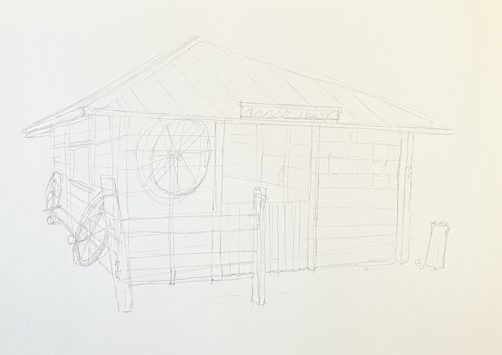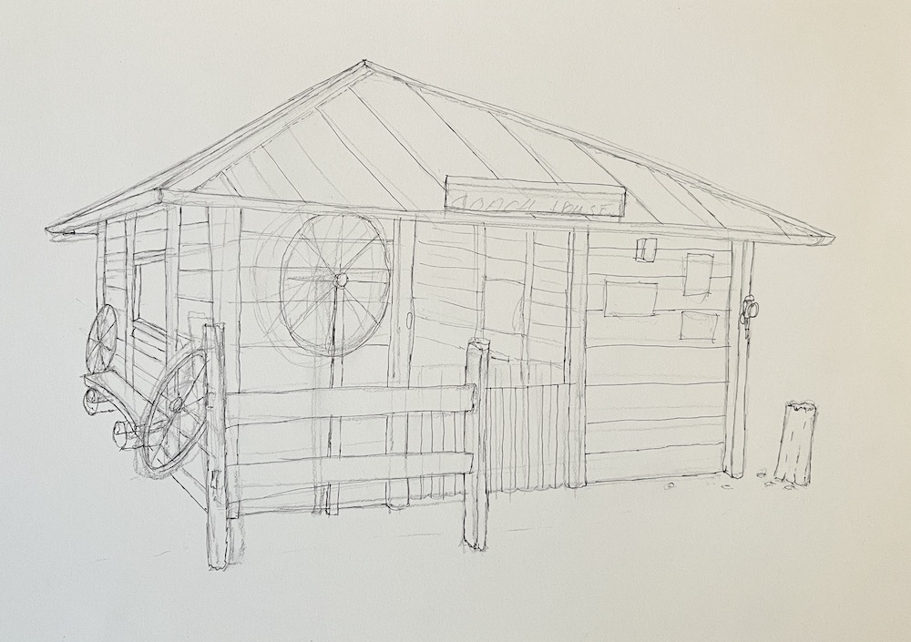 Sketch No 6 from Miles Historical Village is the coach house with all the wheels on the outside of the building. This looked fun until I started to paint the ones on an angle.