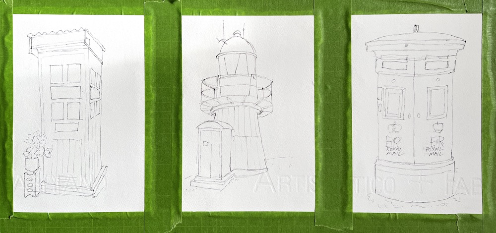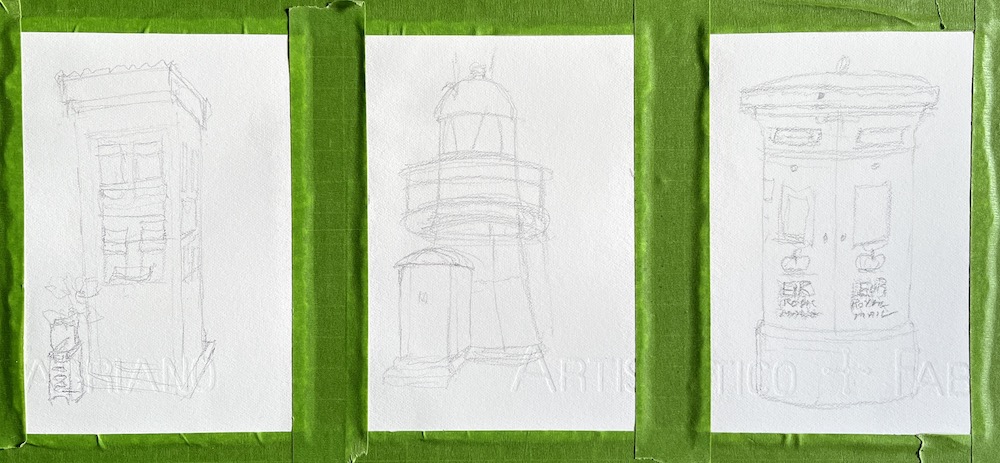 Quick pencil sketch of all three objects, these were secured with frog masking tape.