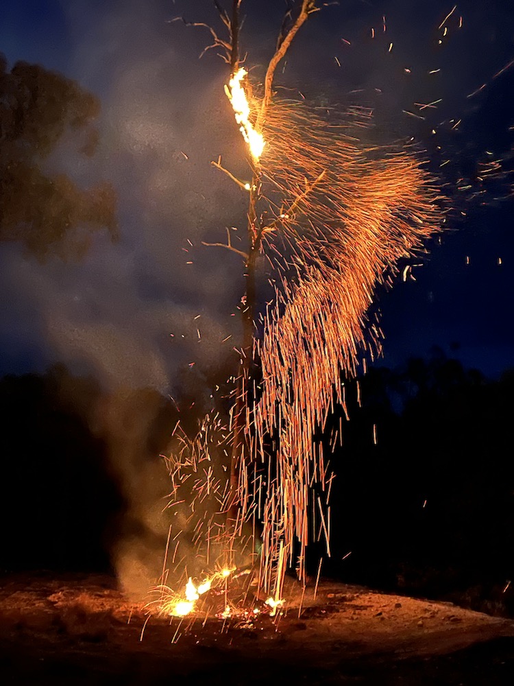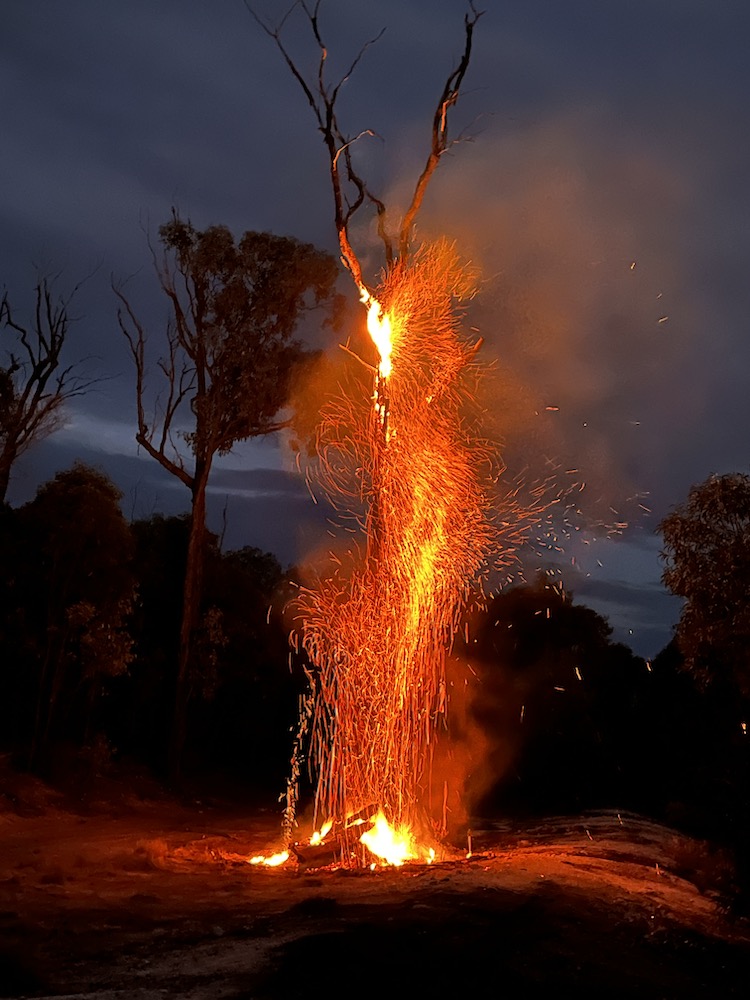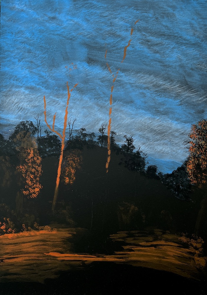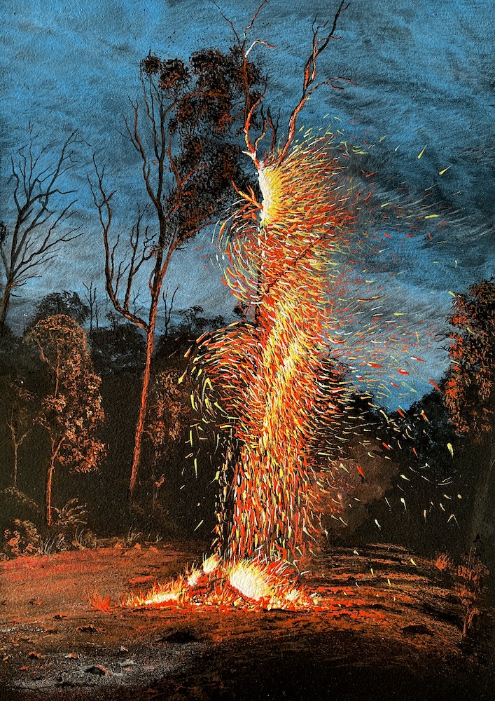 As I rode around the corner I saw an orange glow and a tree on fire dropping sparks. David was stood next to his bobcat and pointed to a tree on fire and said “bush Fireworks” which became the name of this painting.