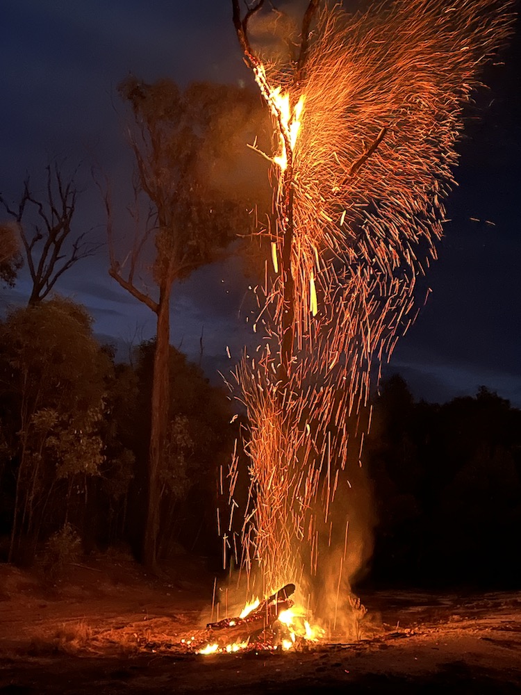 It had been a busy day back burning to reduce the fuel around Possum Park in the event of future bush fires. As it happened two weeks later a few bush fires were burning out of control in the local forests, they lasted over a week and came within 4km of Possum Park. So our preparations were not in vain.