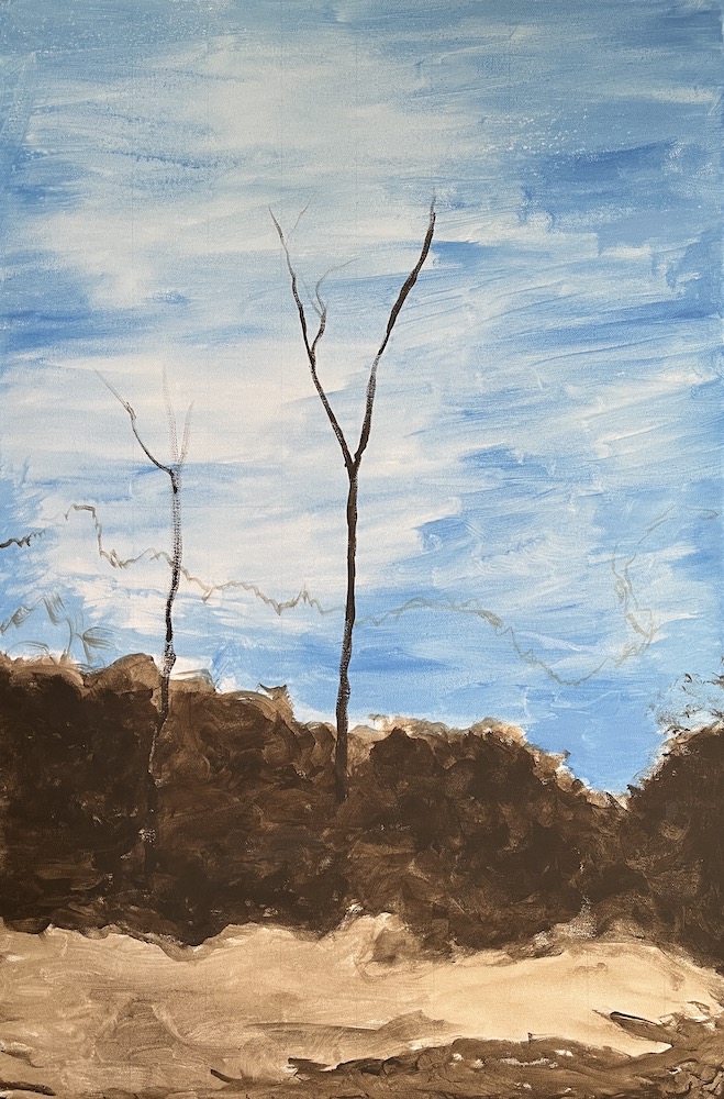 As I rode around the corner I saw an orange glow and a tree on fire dropping sparks. David was stood next to his bobcat and pointed to a tree on fire and said “bush Fireworks” which was the name of my first painting.