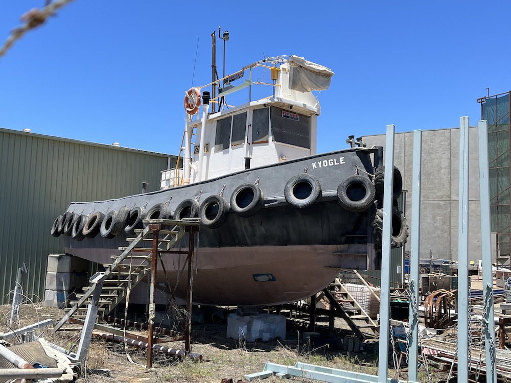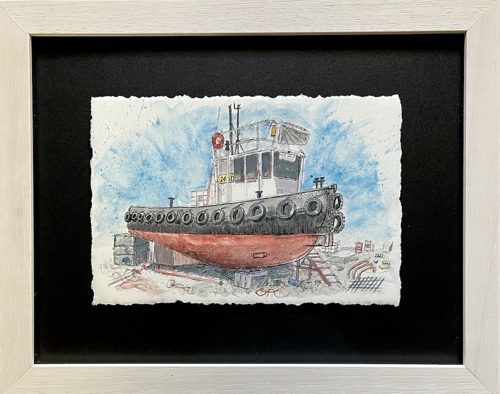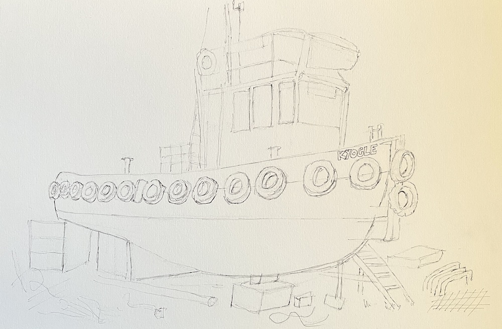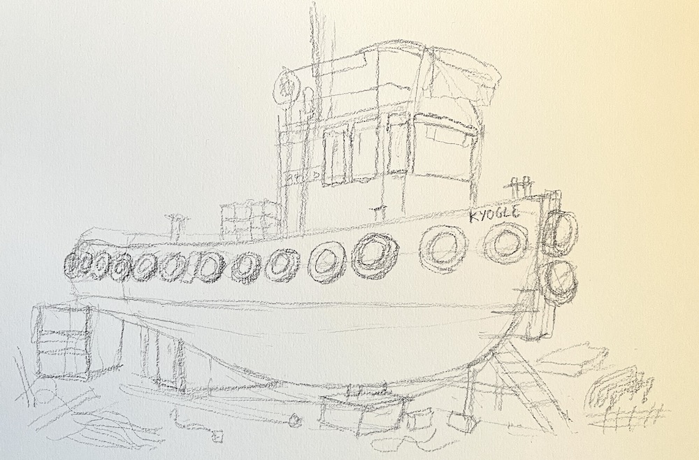 When I went down to visit my mother we were driving past the boat yard and I yelled out “oooh stop”, which I have learned is better than just yelling out stop when someone else is driving. Anyway I ran over to the fence and took a photo on my phone of this delightful little tug boat at Hervey Bay. I thought this would make a stunning sketch in my new style I’m trying out and I just love all the junk lying around it.