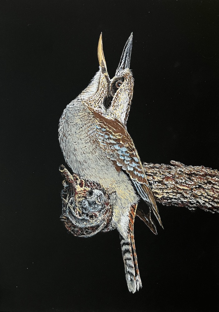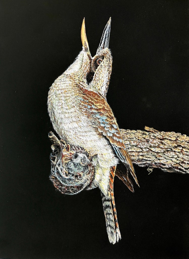 The kookaburra snapped its beak at the swooping noisy minors and I managed to capture the moment. So in this instance it’s not actually laughing but defending itself from other birds and also missed out on lunch.