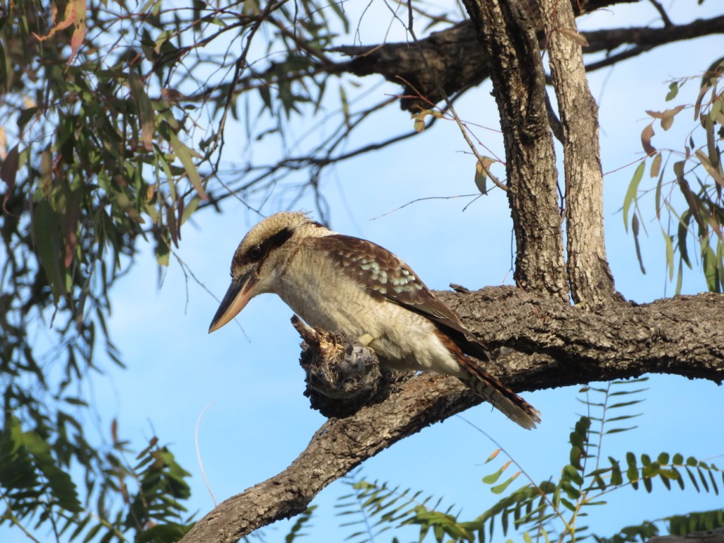 While I was camping at Waruma Dam I spotted a Laughing Kookaburra in a tree staring down at the ground. It had obviously spotted something in the grass and was about to swoop down for lunch. Unfortunately for the kookaburra two noisy minors were not impressed with an intruder in their part of the park and started swooping it.