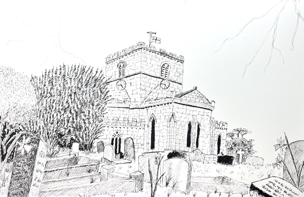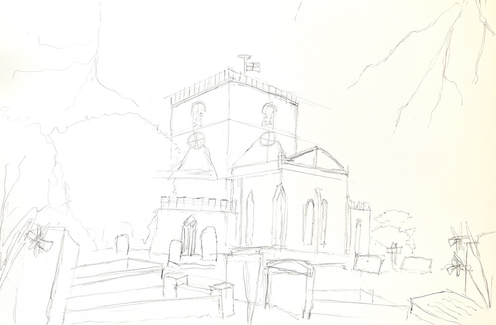 So I left the sketch overnight and with fresh eyes in the morning decided I just wanted the skeleton of the tree, more fitting for a graveyard don’t you think.