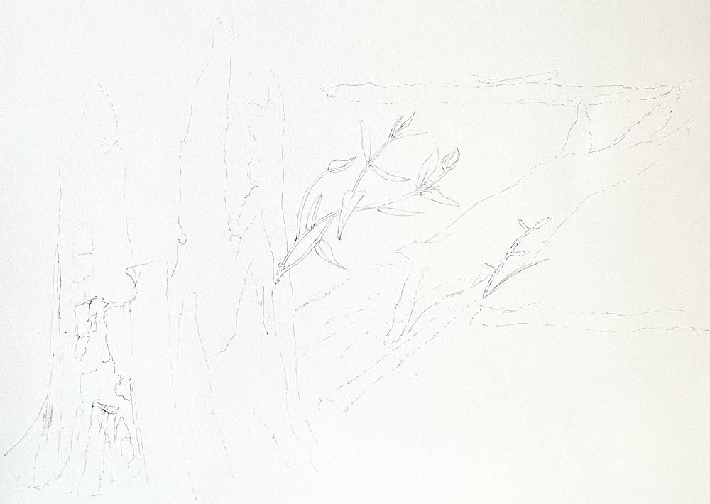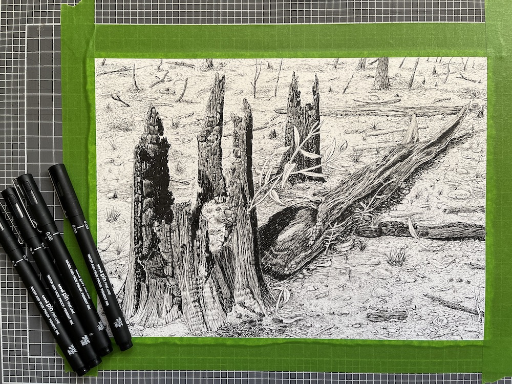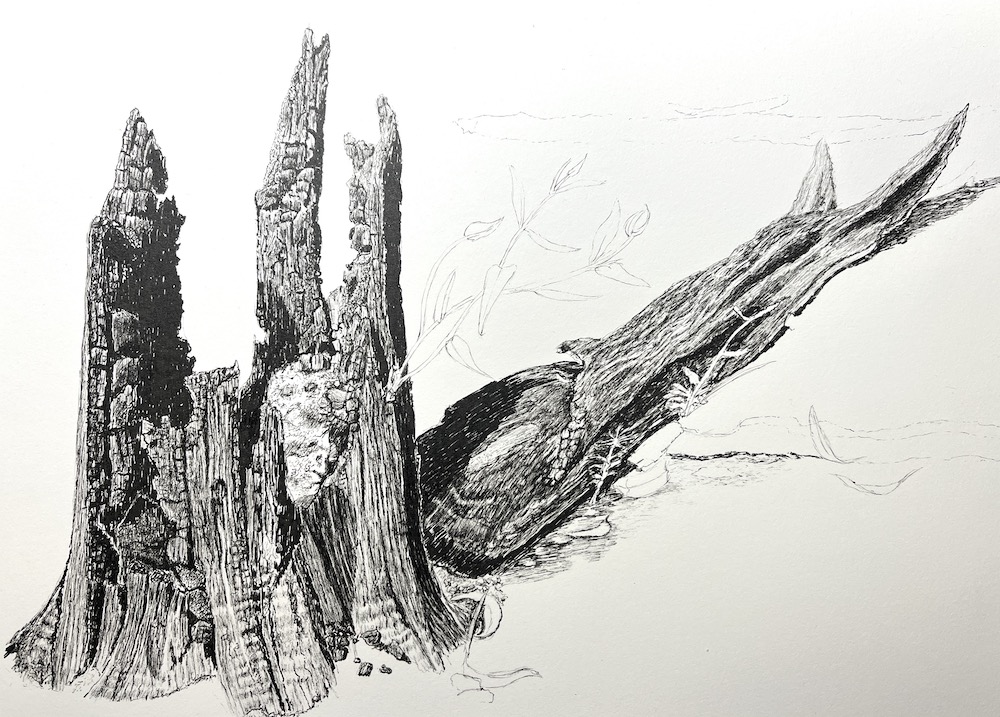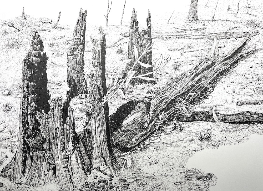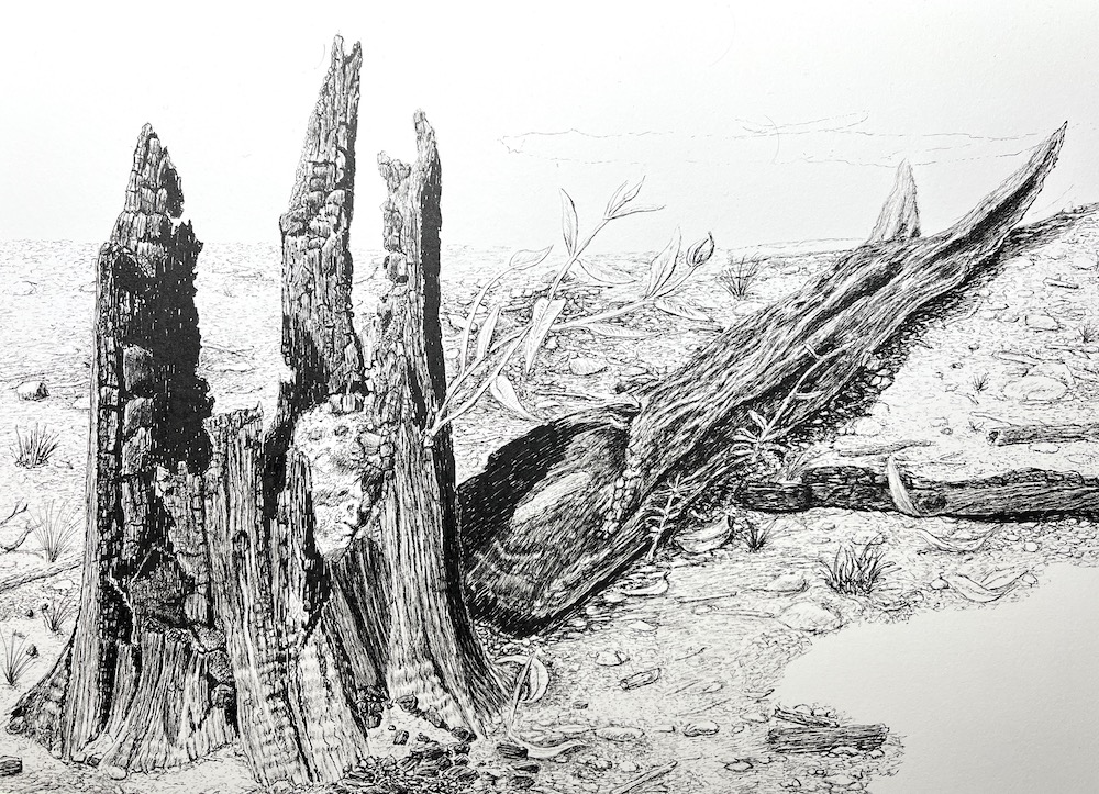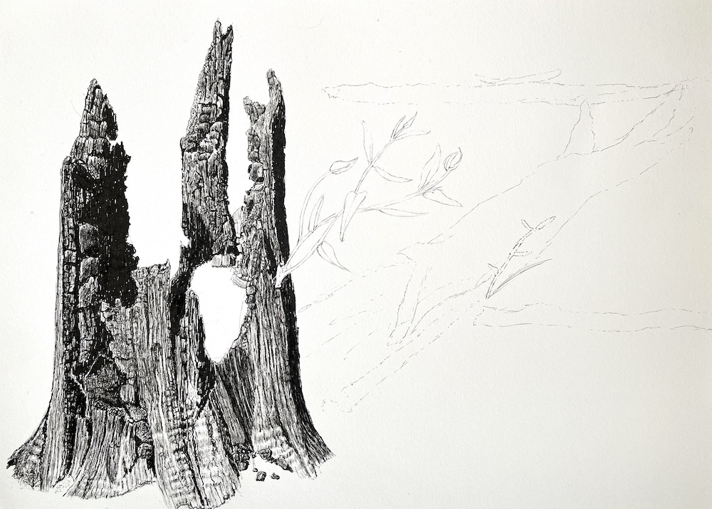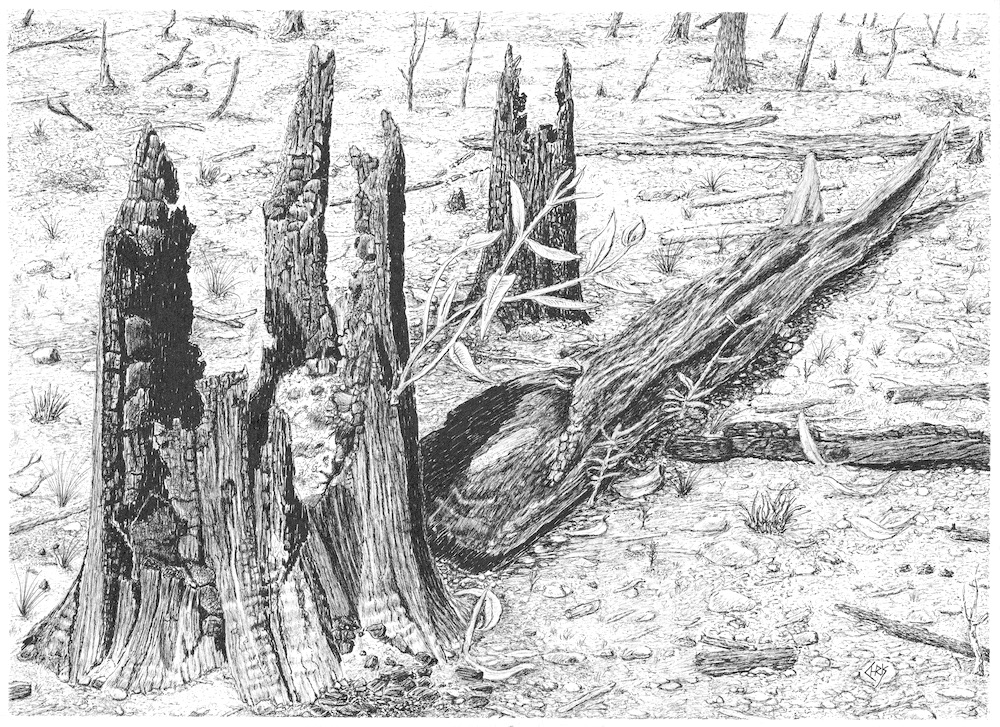 About two weeks after the bush fires, I went to the state forest to see what the damage was like and see if I could find some tree stumps to sketch as this was my new sketching subject.
