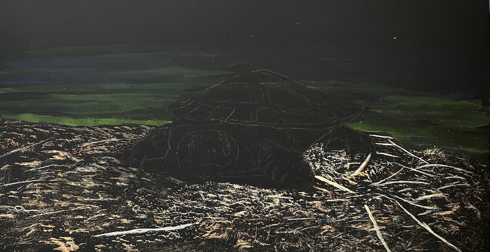 I imported both photos into procreate and removed all the background from around the turtle. This revealed the photo of the dam underneath, I then erased the top half of the dam photo creating a nice black background.