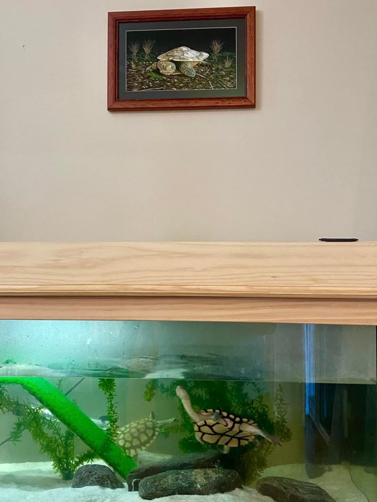 Squirtle is the envy of all the other turtles with its portrait hung above the tank.