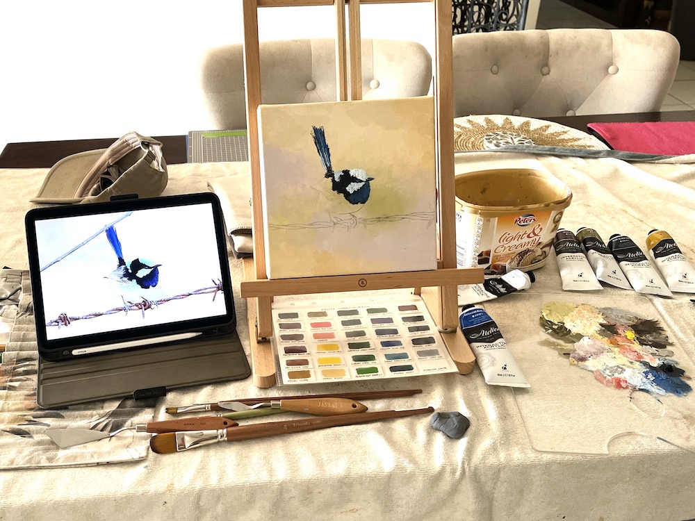 My new desktop setup for acrylic paint, this was because I was house sitting and I thought the two dogs might knock over my normal easel.