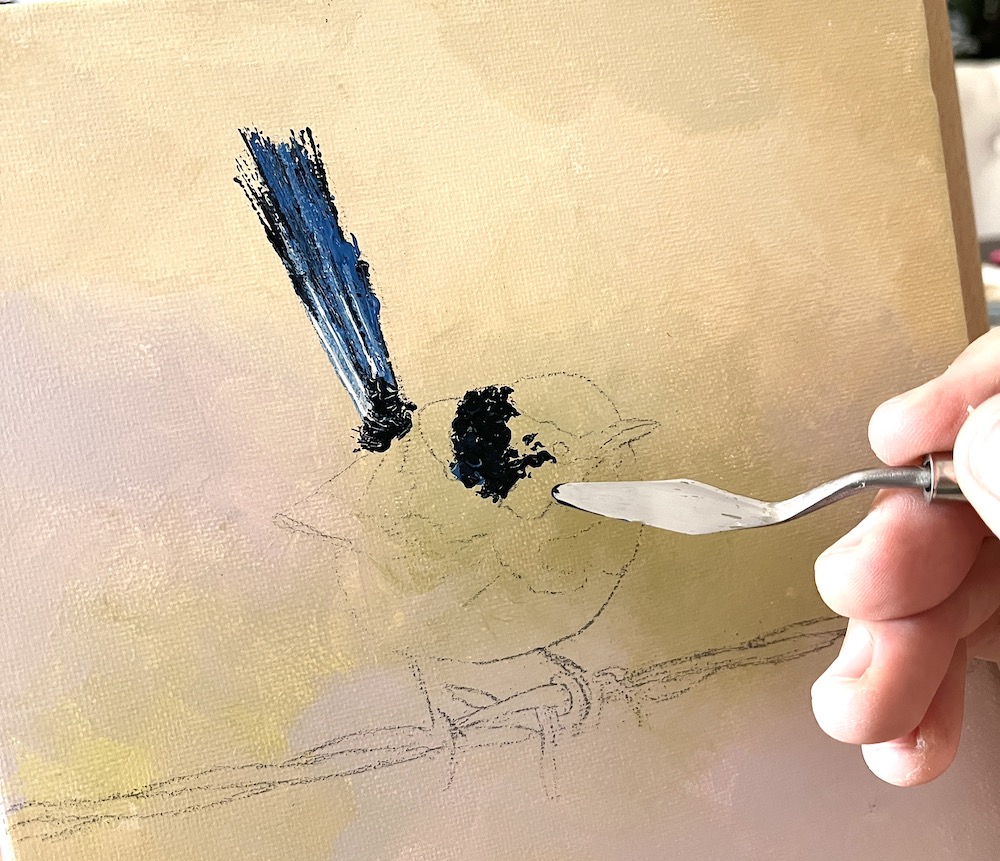 I thought I would try out painting with a palette knife to get some layering effect on the feathers.