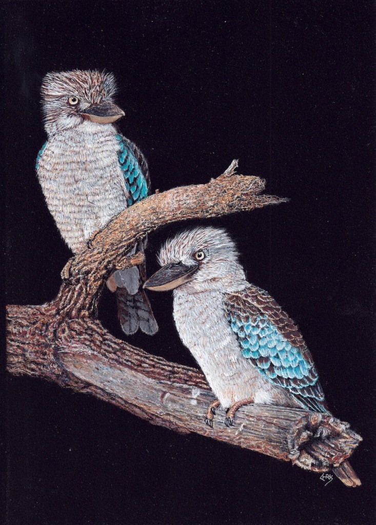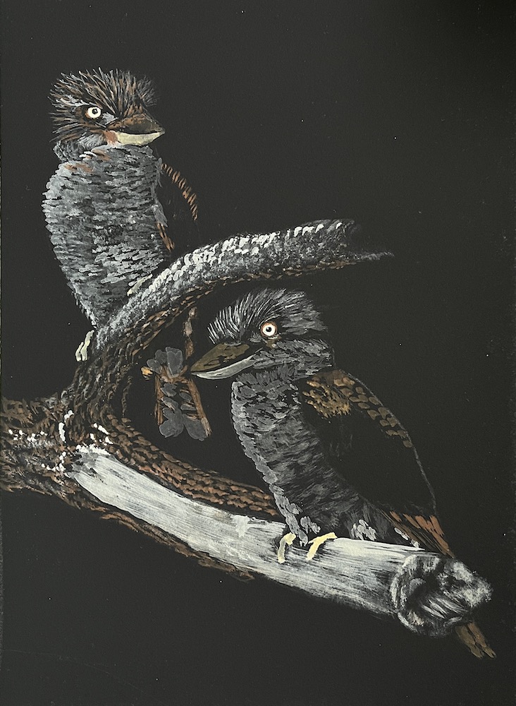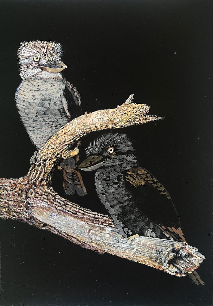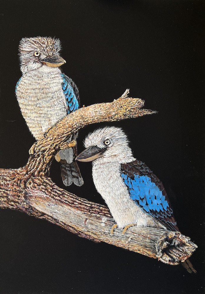 This artwork of the blue-winged kookaburra’s was a commissioned artwork so I don’t really know much about the location, apart from some place on the north coast of Queensland. This is the third painting I’ve been commissioned to do for this couple because they have 3 children and want to leave them each a painting. Which I think is a lovely thought and to know that my artwork will be passed down each generation hopefully.