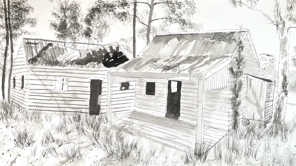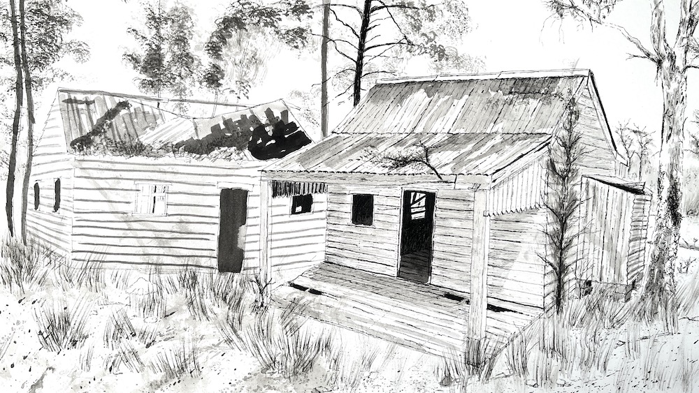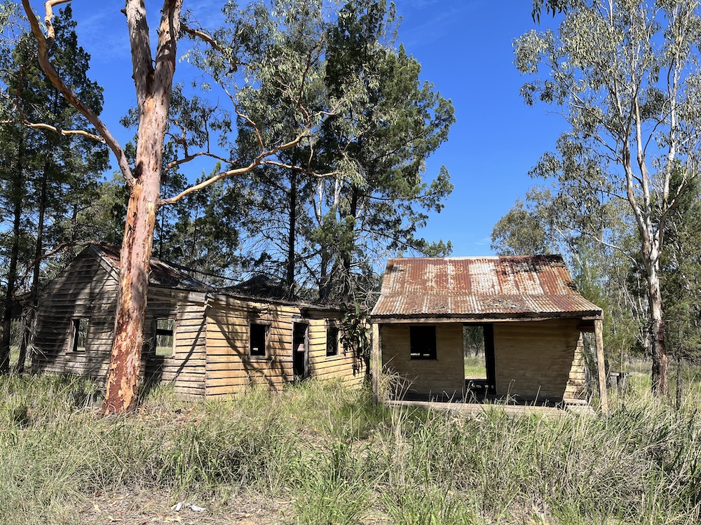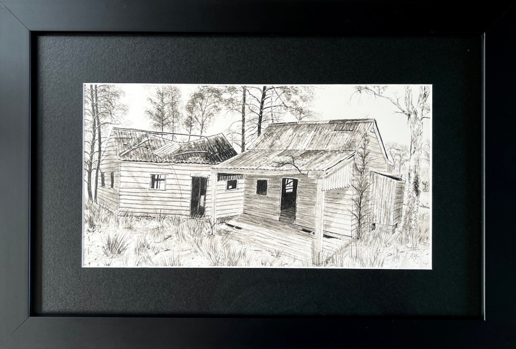 I entered this artwork into the Miles show and got a second place. Just as I was taking my artworks down I could hear someone calling my name, I automatically thought oh bugger what have I done. Turns out the property owners the Walshes wanted to talk to me and ask about the sketch. They said “I think this is our property just north or Possum Park”. Yes this was correct and they still own the land, the buildings used to belong to their family and apparently there was also a third building on the property but only two remain standing today.