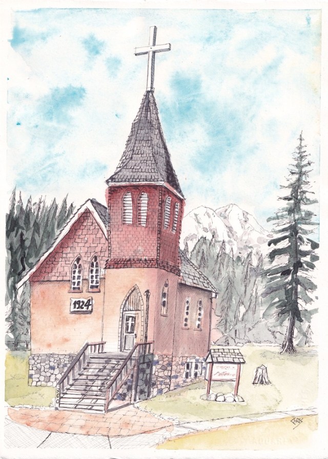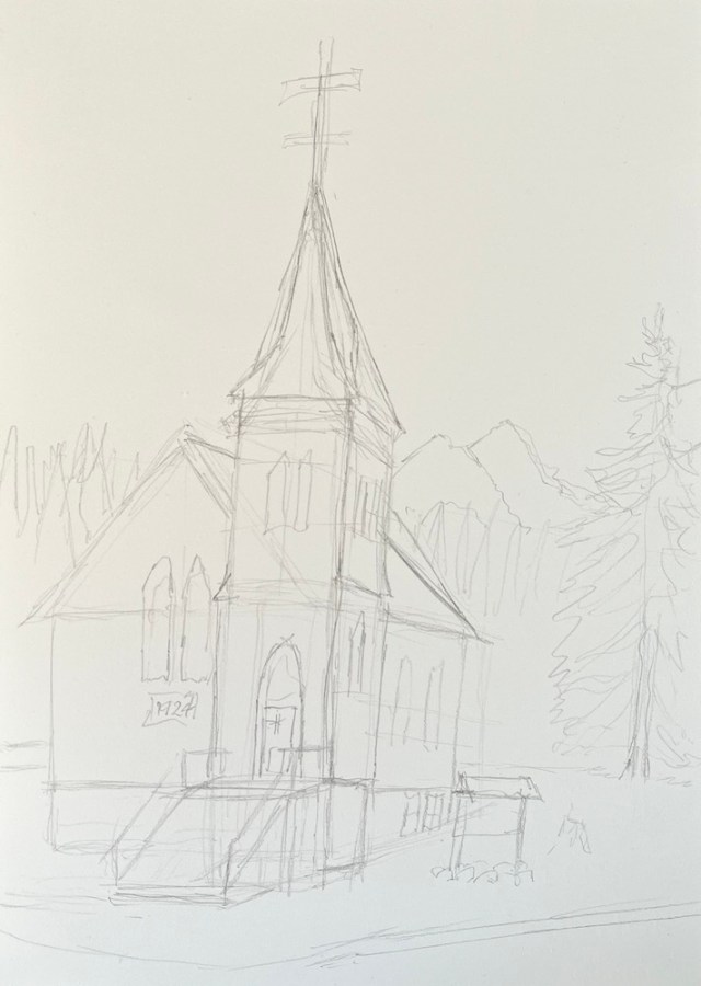 As I was walking back to the hotel after dinner we came across this beautiful little church with a magnificent backdrop of snow capped mountains. I knew this would be a sketch when I got back home.