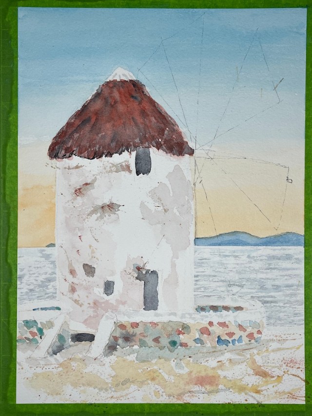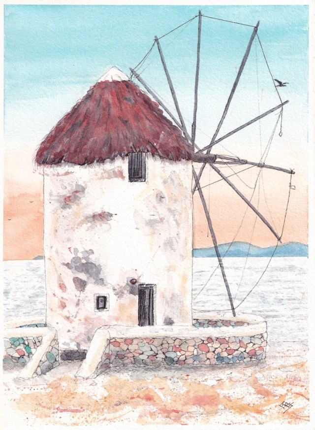 My reference photo was captured from a trip to Mykonos, Greece, back in 2012 with my sister. After viewing these windmills during the day, we decided to go back and watch the sunset from a different viewpoint. I love traveling the world, as there is so much to experience. I just wonder if I’ll get chance to sketch and paint it all.