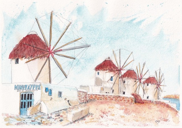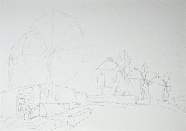 My reference photo was captured from a trip to Mykonos, Greece back in 2012 with my sister. Early one morning, I went for a 10 km jog into town before all the other tourists arrived. I captured this photo of the windmills. If I had known years later I would be sketching them, I would have taken more photos of this stunning location.