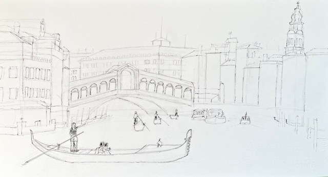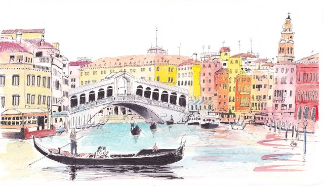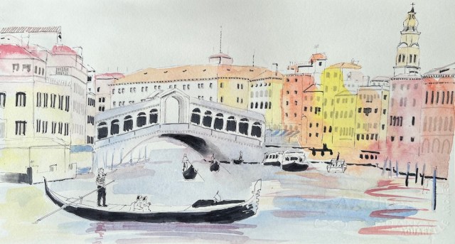 Another sketch from Venice; this time the main focus is the Ponte Di Rialto, which I have walked across a few times and taken a gondola ride underneath. I must admit I do like a good bridge, and there are some stunning ones in Europe. I find the best time to view landmarks is on an early morning jog before everyone wakes up. Since I have taken up urban sketching, I really appreciate buildings and bridges, which at the time I enjoyed looking at but did not really appreciate as individual structures that come together as a unit to create a complex, colorful urban landscape.