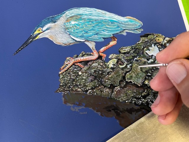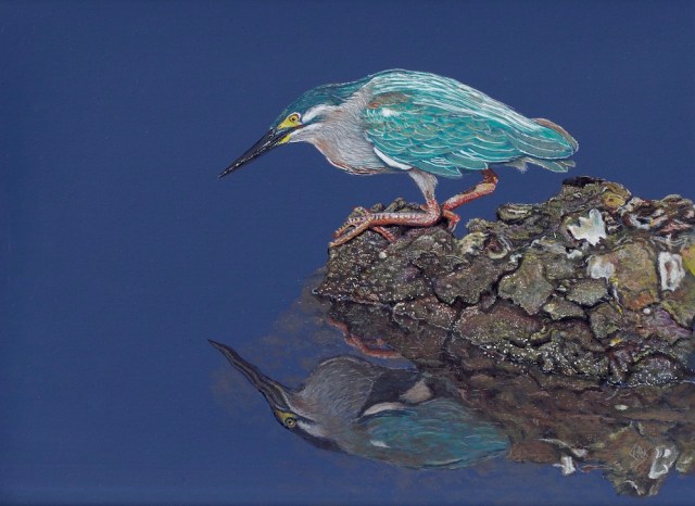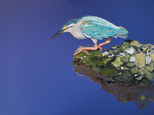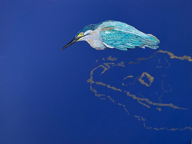 I considered adding a fish to the water but hesitated due to the risk of making a mistake with permanent paint on paper. I also prefer the uncertainty surrounding what the heron is observing.